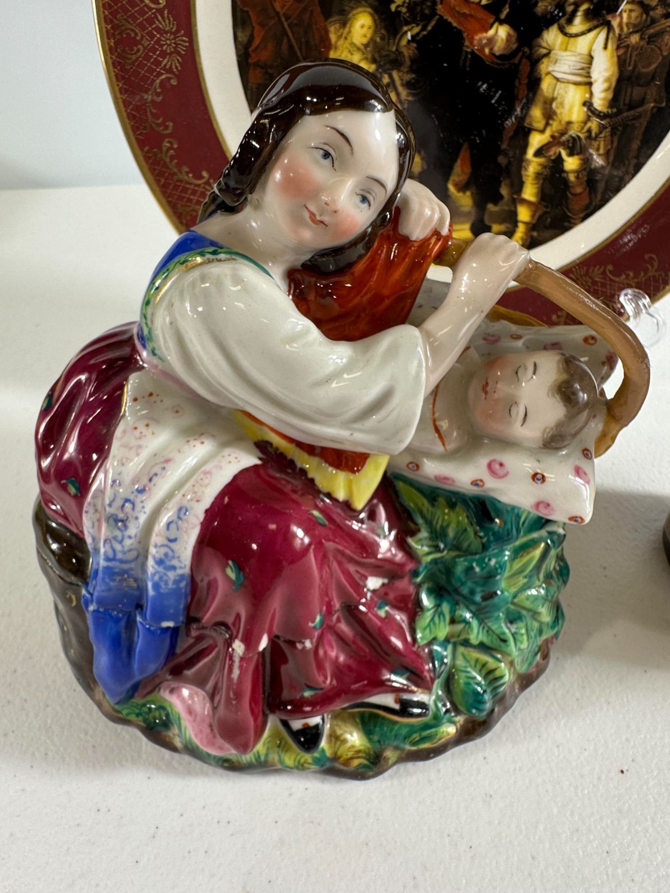 Shelf lot featuring a Rembrandt 'Night Watch' display plate and three figural pieces including two Toby 'style characters and a mother & child group. Minor wear and base crazing.