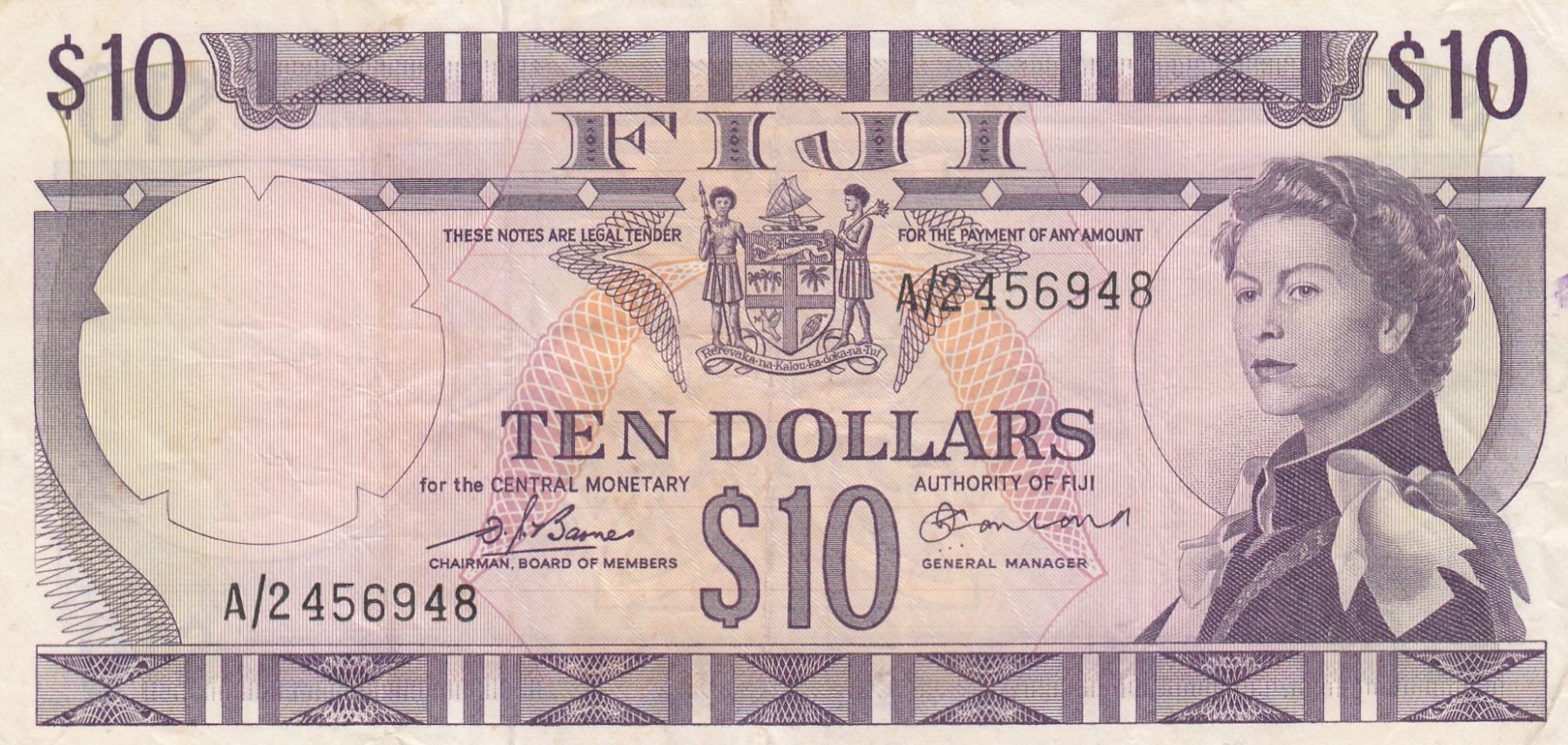 Fiji, 10 Dollars, 1974, XF, p74bbr/Queen Elizabeth II portrait, serial number: A/2 456948