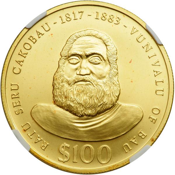 Fiji. 100 Dollars, 1975. Fr-2; KM-38. Weight 0.5031 ounce. Mintage 593 pieces. King Cakobau facing. NGC graded MS-67.