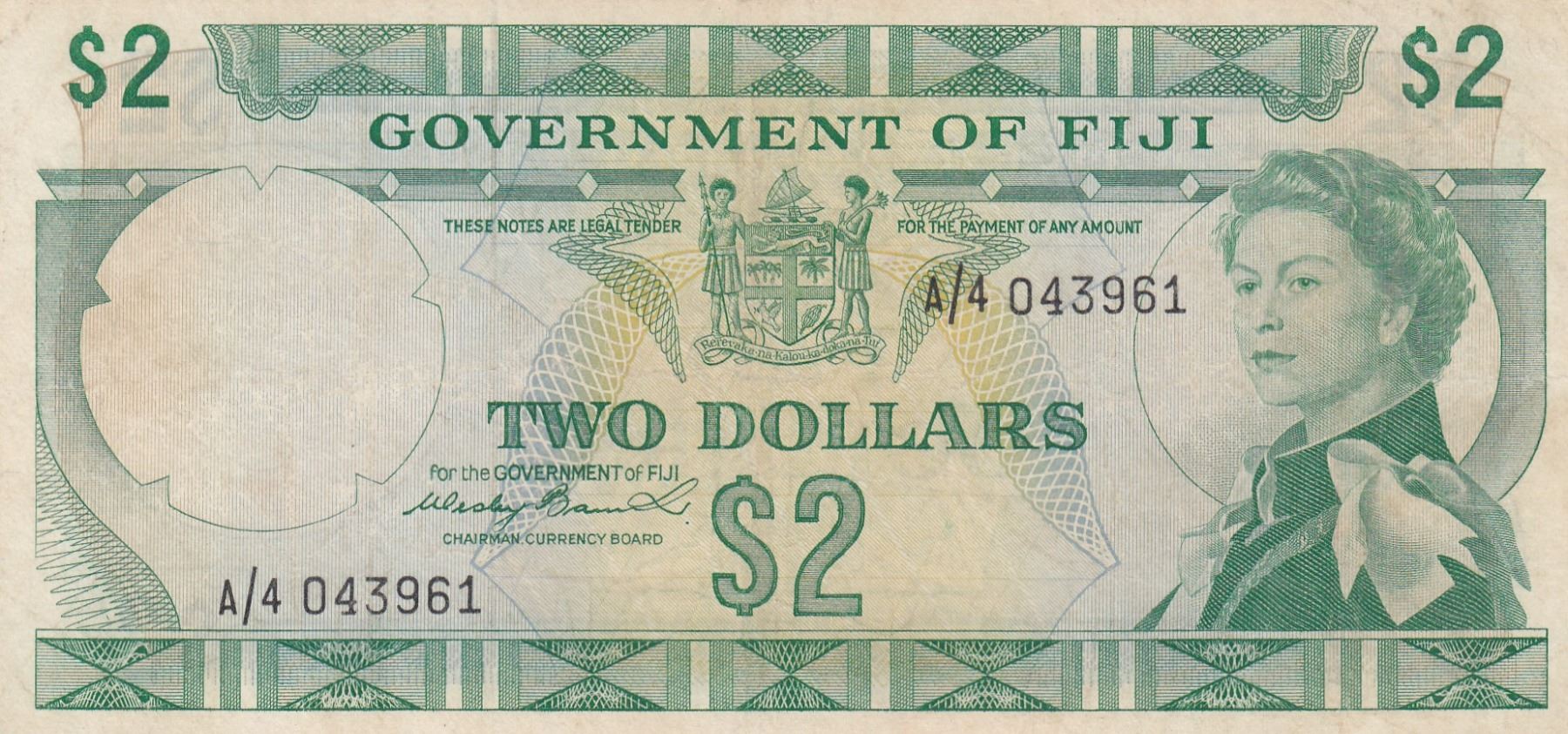Fiji, 2 Dollars, 1971, XF (+), p66abr/Queen Elizabeth II portrait, serial number: A/4 043961
