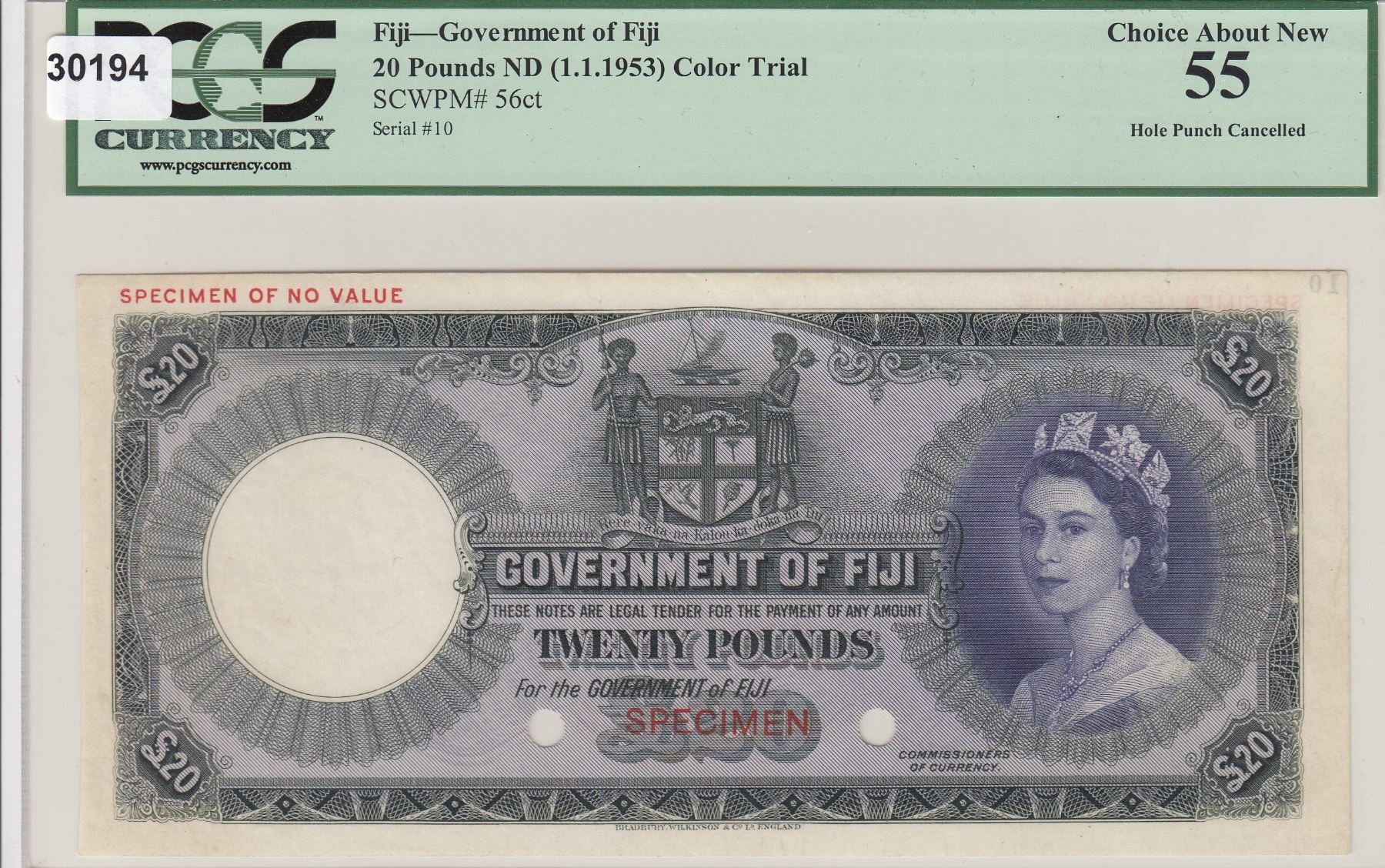 Fiji, 20 Pounds, 1953, AUNC, p56, COLOR TRIAL SPECIMENbr/PCGS 55, Queen Elizabeth II portrait, no se