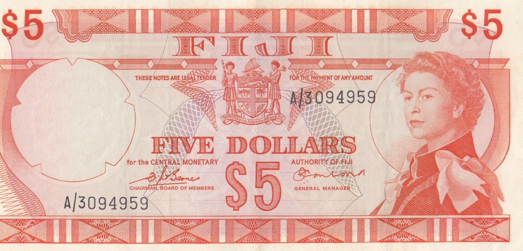 Fiji, 5 Dollars, 1974, XF (+), p73bbr/Queen Elizabeth II portrait, sign: Barnes and Earland, serial number: A/3 094959