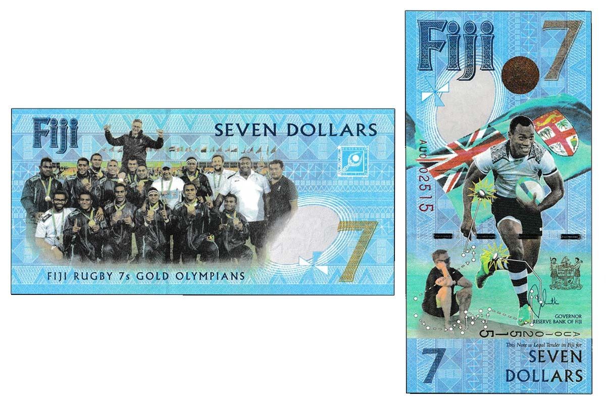 Fiji, 7 Dollars, 2017 Commemorative issue on Fijian Rugby 7s Team winning the Gold Medal in Rio de Janeiro, Brazil, Obv. Fiji flag, Olympic coach Ben Ryan sitting on Sigatoka sand dunes, Olympic captain Osea Kolinisau running with ball gold medal, Rev. Fiji Rugby 7s Gold Olympics with Prime Minister Josaia Voreqe Bainimarama and team officials, (P#120), UNC, Rare.
