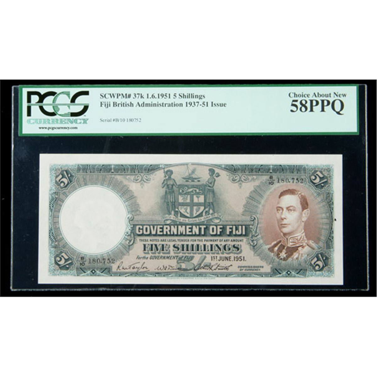 Fiji SCWPM# 37k, 1.6.1951 5 Shillings. PCGS Choice About New 58PPQ. . Fr-P-37k. This scarce note is seldom seen much finer, and the Krause reference prices uncirculated examples at $850 in their latest reference. This one comes close, but some light handling is all that prevents a condition census grade.