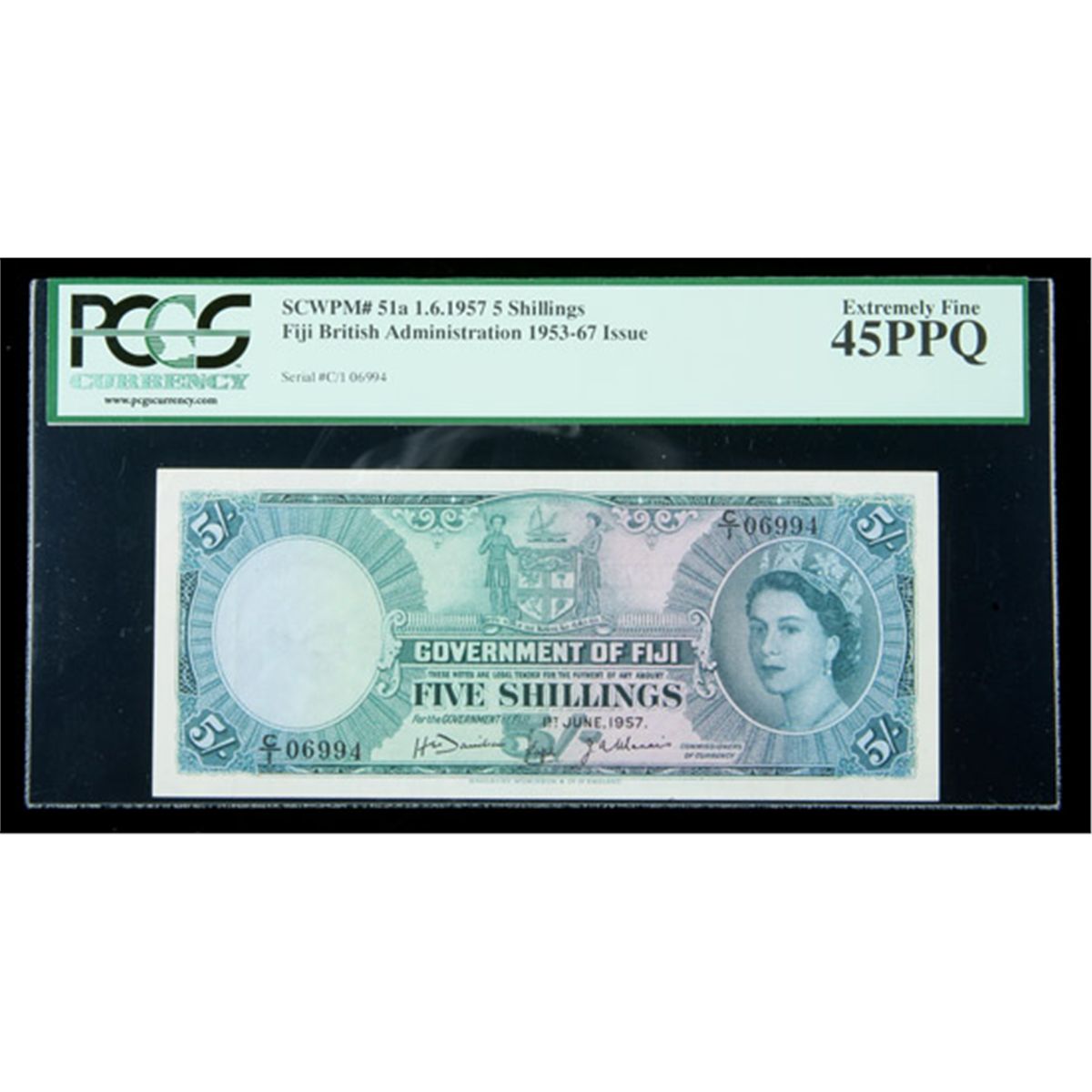 Fiji SCWPM# 51a, 1.6.1957 5 Shillings. PCGS Extremely Fine 45PPQ. . Fr-P-51a. A few light folds are the only consequential factors on the grade of this lovely piece.
