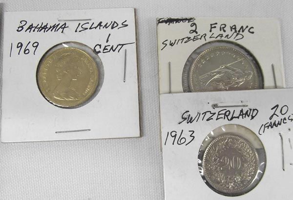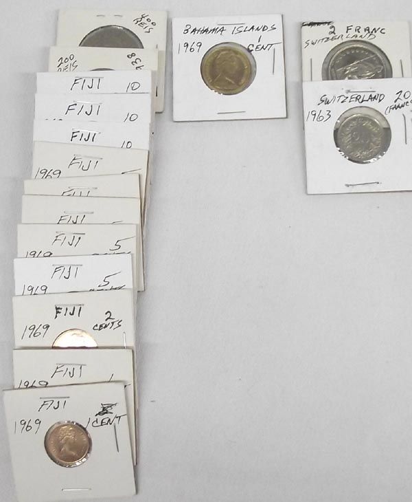 Fiji, Swiss, Bahamian & Brazilian Coins. Five Fiji 5 cent coins, Three Fiji 10 cent coins, One Fiji 2 cent coin, Two Fiji 1 cent coins. One Swiss 2 franc coin, One Swiss 20 franc coin, One Bahamian, 1 cent coin, One Brazilian 400 Reis coin, One Brazilian 200 Reis coin.