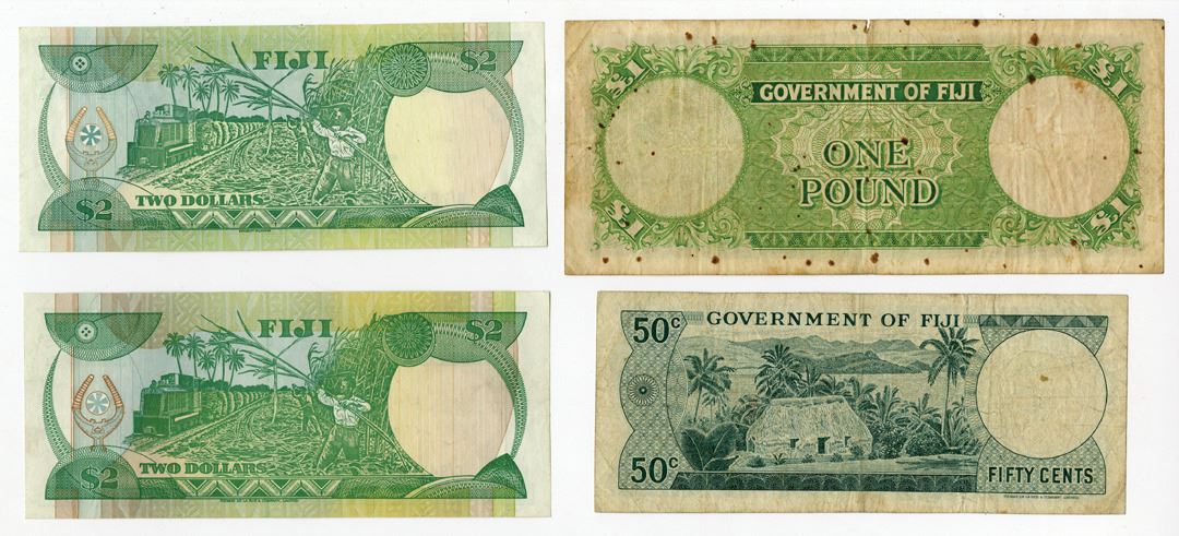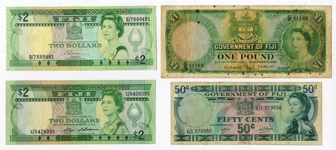 Fiji, 1959 to 1988. Lot of 4 Issued Banknotes, Includes: Government of Fiji 1 Pound, P-53c, 1959, BWC; 50 Cents, P-58a, ND (1969), TDLR; Central Monetary Authority 2 Dollars, P-77a, ND (1980), TDLR; Reserve Bank of Fiji 2 Dollars, P-87a, ND (1988), BWC. Notes are in Fine to VF condition. (4). Sold "AS IS" no returns accepted.