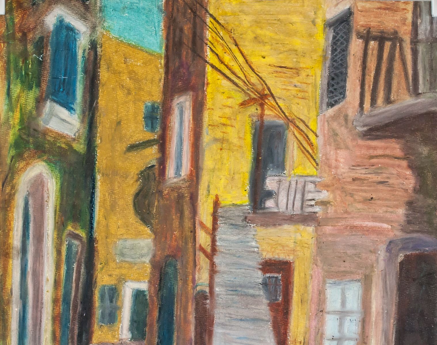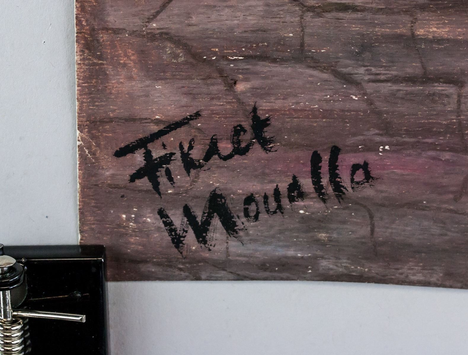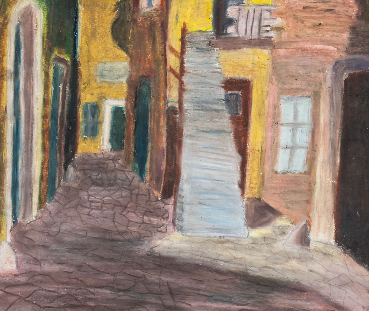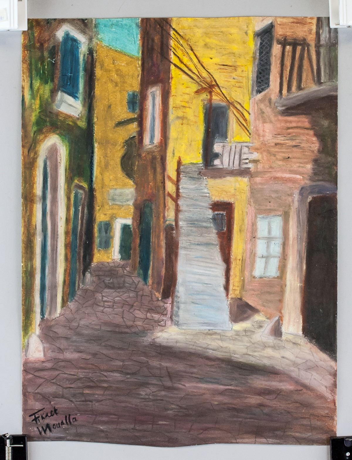 Pastel on paper. Featuring a landscape scene of a city alley. Signed Fikret Moualla on the lower left corner. Attribtued to Fikret Moualla (1903-1967, Turkish). 44.5 x 33 cm (17.5 x 13 inches). PROVENANCE: Southern Ontario estate