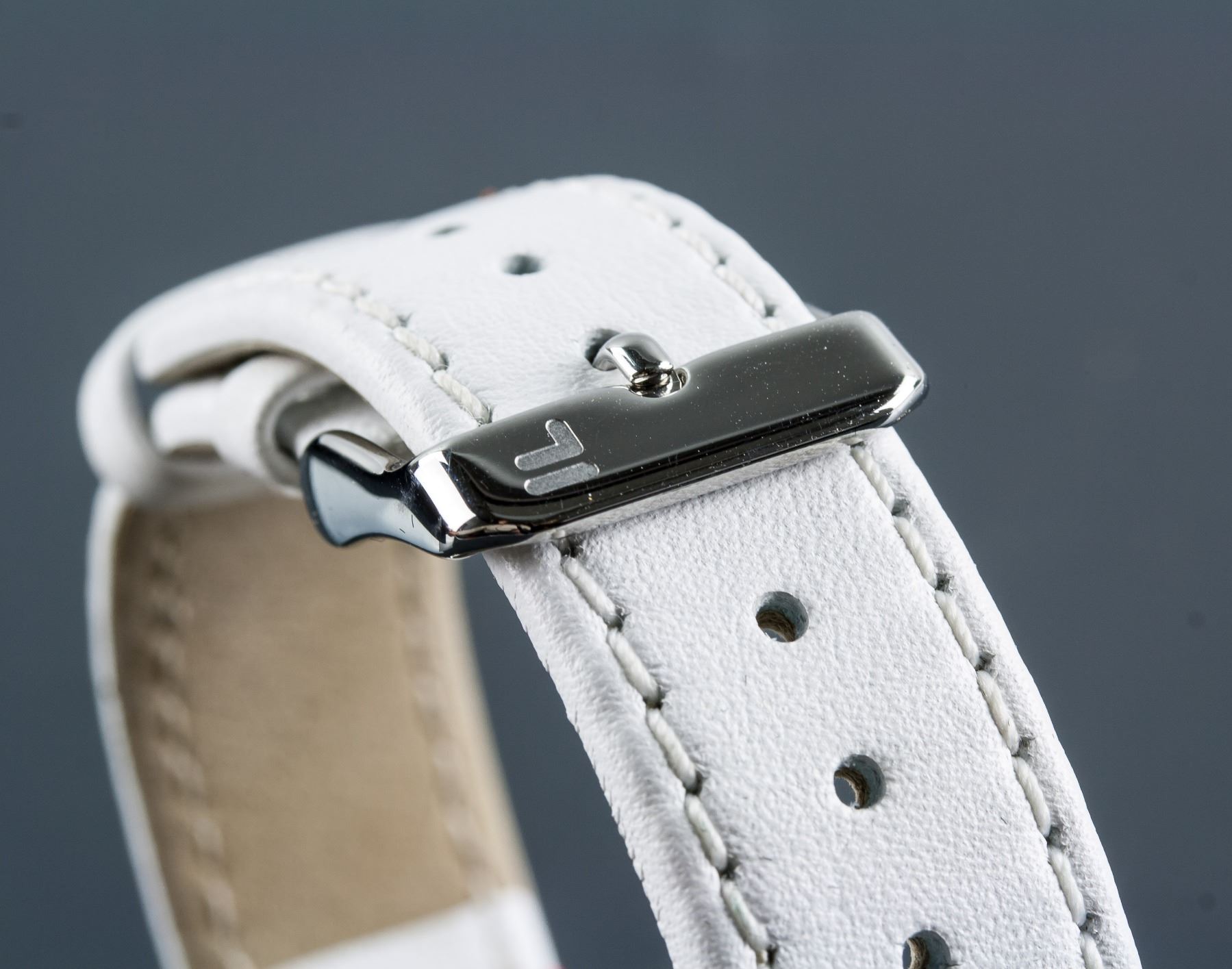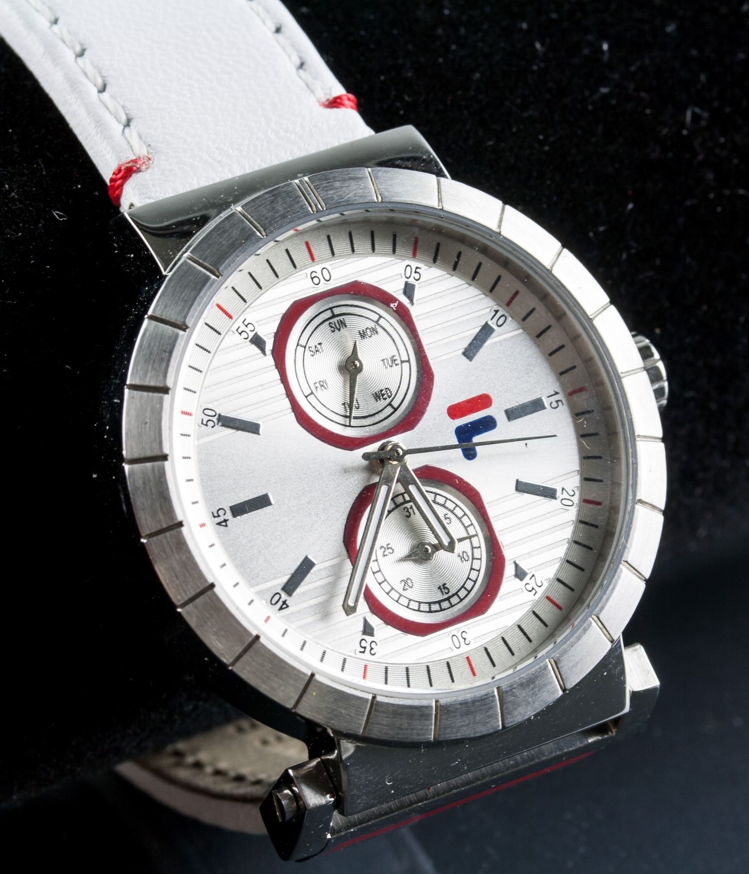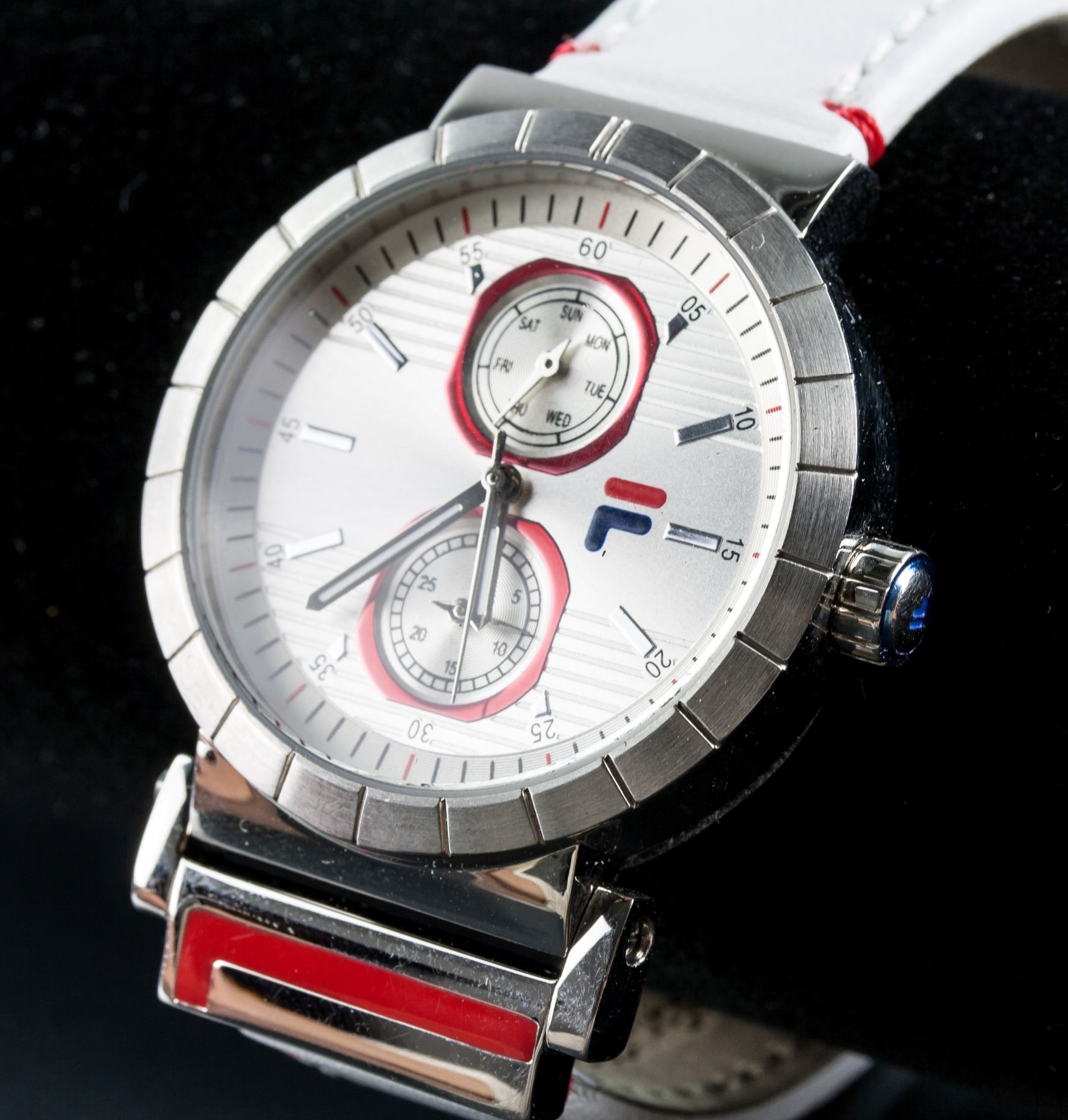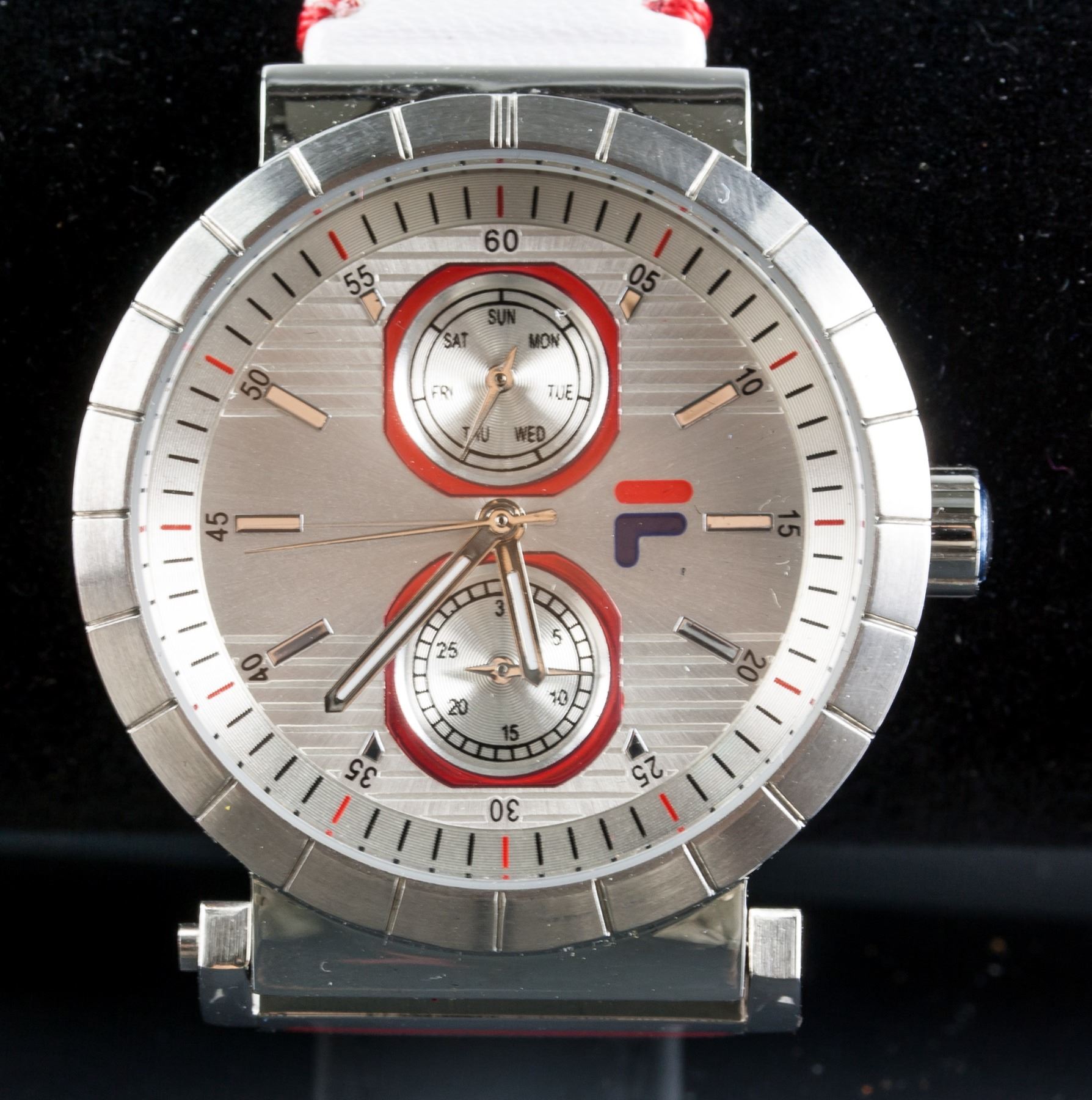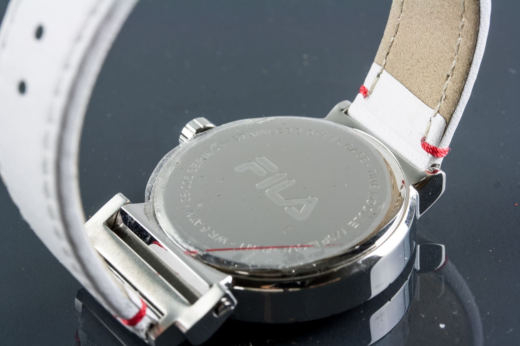 Fila stainless steel analog watch; time module VX3P Movement; 38-500 series; with white genuine leather band