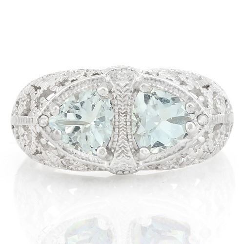 2 Aquamarine trillion cut gemstones are set in a platinum over sterling silver filigree ring with 0.01ctw diamond accent. Size 7. 3.8g