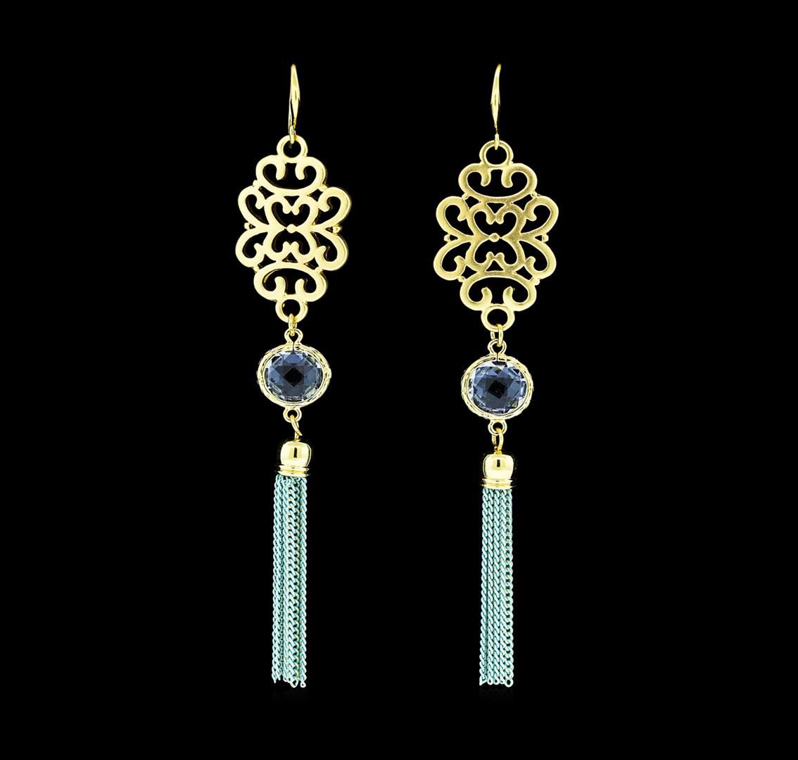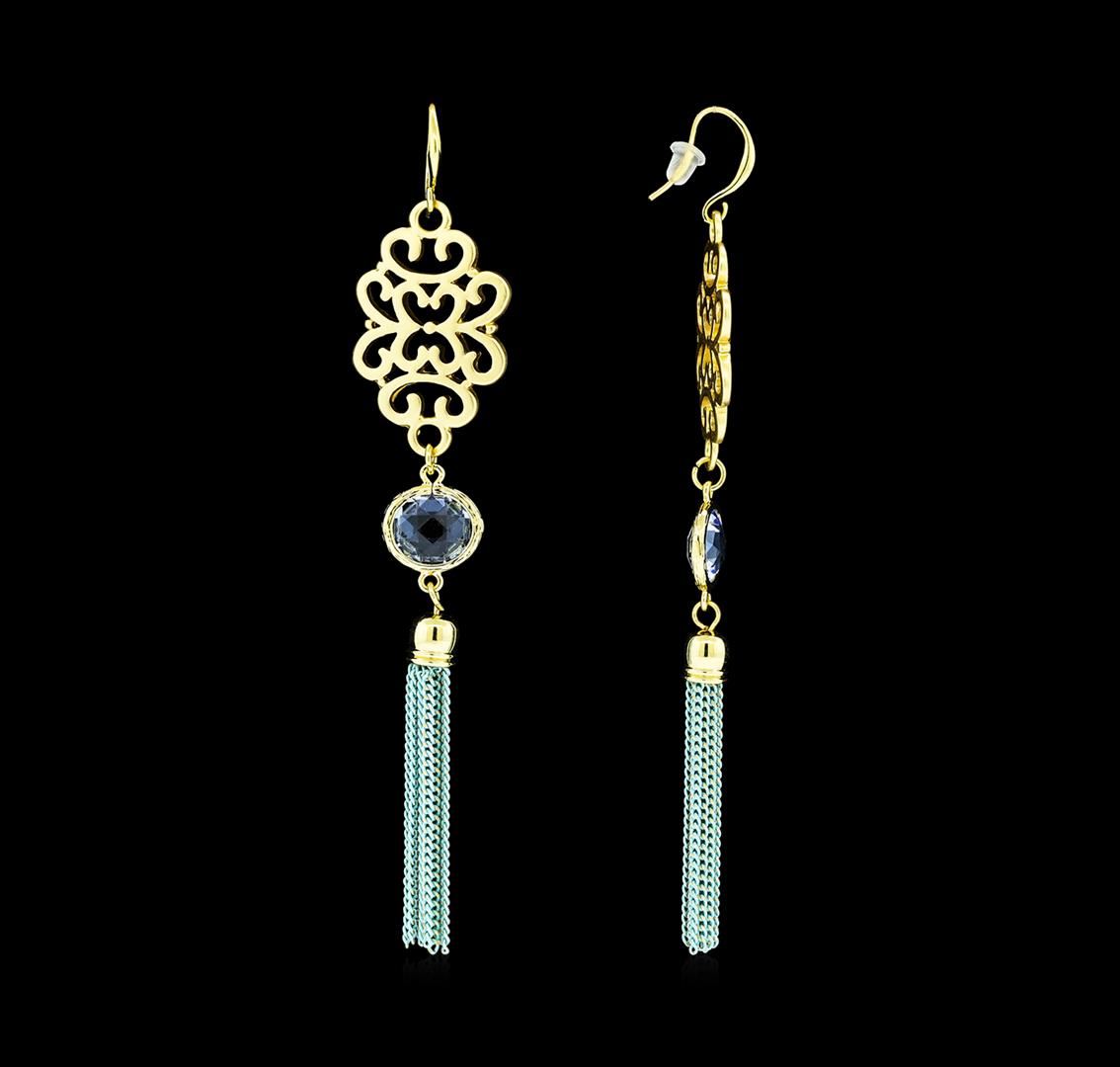 High end designer jewelry. Filigree Chain Tassel Earrings - Gold Plated. Gold Plated Chain. Gold/ Aqua. Hook. Total Weight: 13.7 grams.