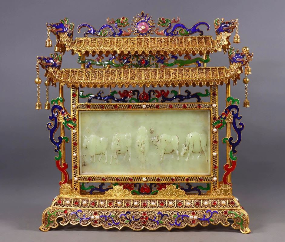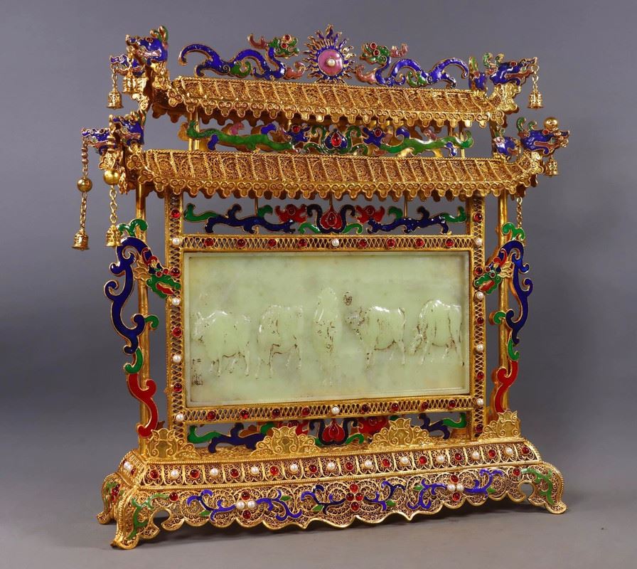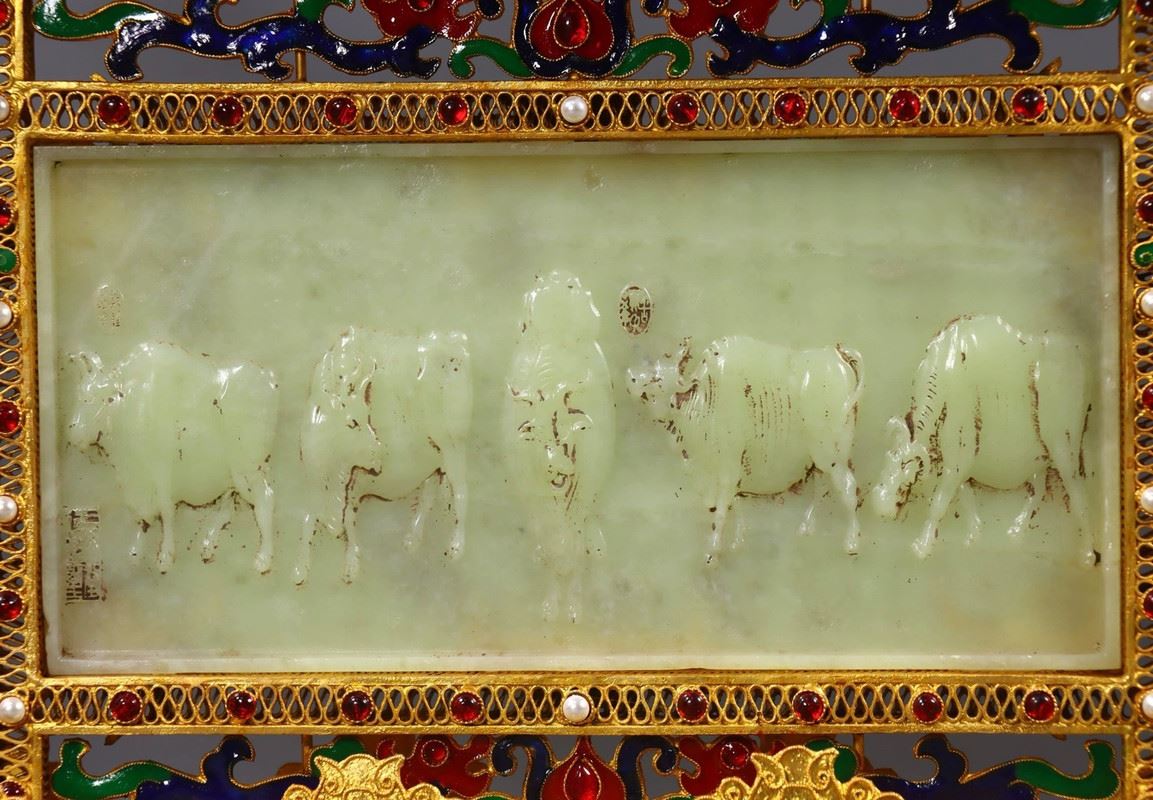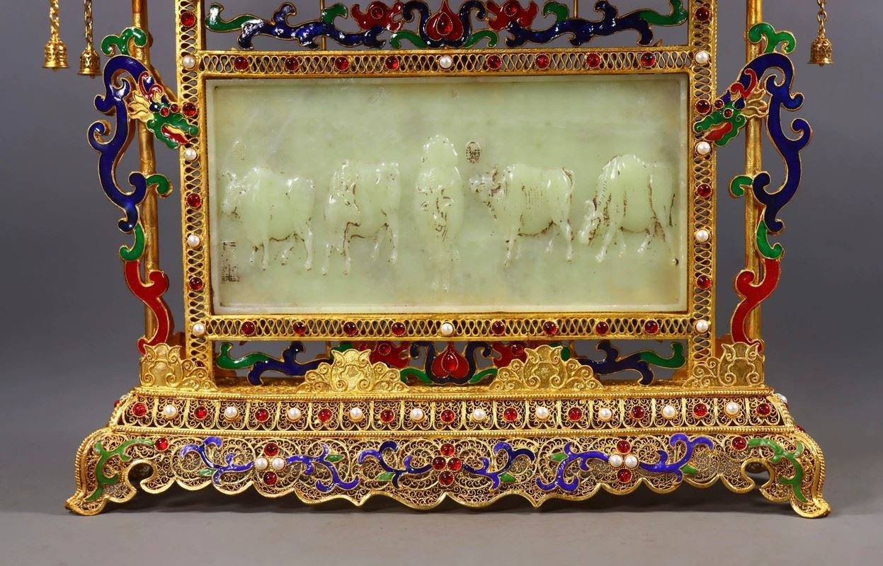 This filigree gilt inlaid Hetian jade five oxen screen showcases exquisite craftsmanship, combining traditional techniques with artistic brilliance. At the center of the screen is a piece of fine Hetian jade, intricately carved with five lifelike oxen, symbolizing hard work, wealth, and stability. The surrounding filigree gilt decorations are luxurious and elegant, with the golden accents complementing the soft tones of the Hetian jade, enhancing the overall opulence of the piece. The design is both ancient and majestic, rich in cultural symbolism, making this screen a valuable and collectible work of art.