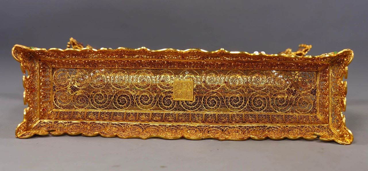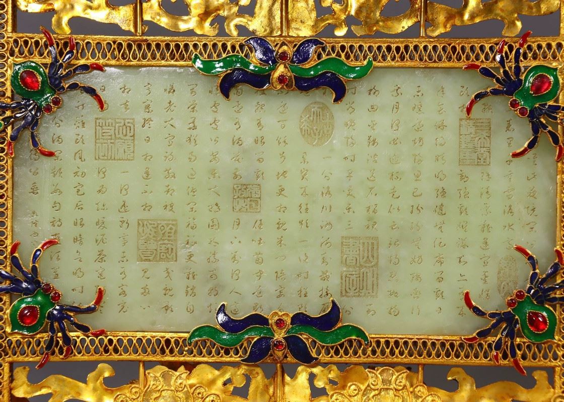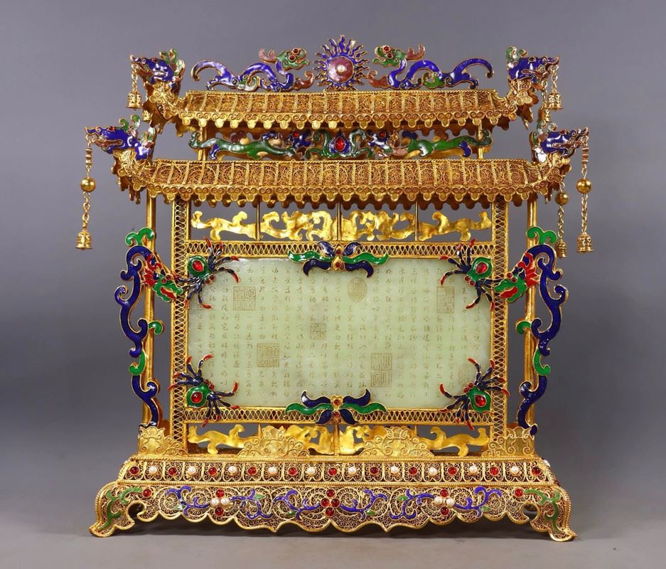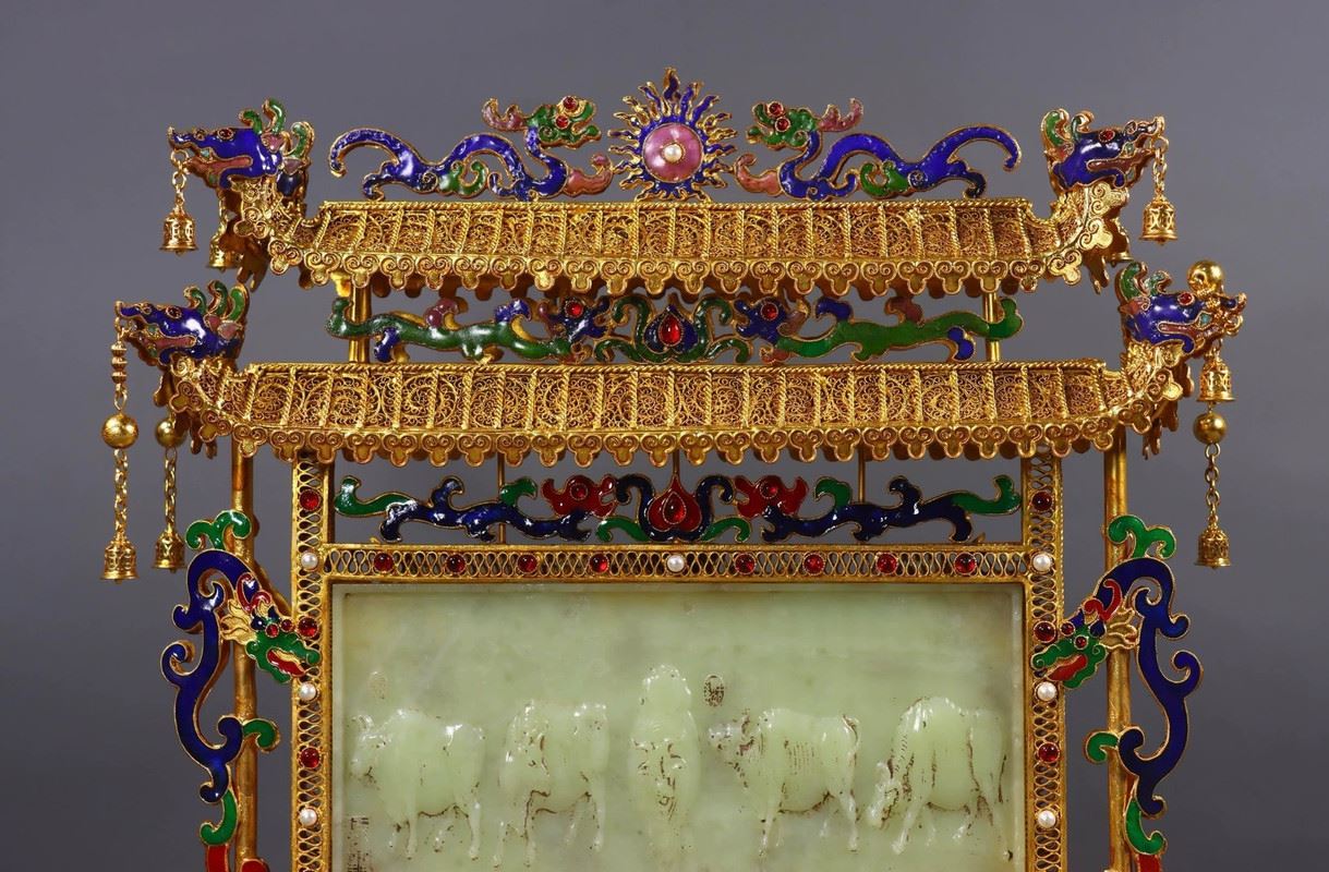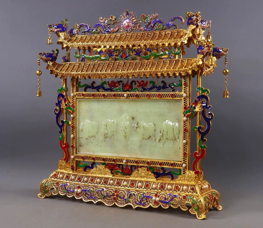 This filigree gilt inlaid Hetian jade five oxen screen showcases exquisite craftsmanship, combining traditional techniques with artistic brilliance. At the center of the screen is a piece of fine Hetian jade, intricately carved with five lifelike oxen, symbolizing hard work, wealth, and stability. The surrounding filigree gilt decorations are luxurious and elegant, with the golden accents complementing the soft tones of the Hetian jade, enhancing the overall opulence of the piece. The design is both ancient and majestic, rich in cultural symbolism, making this screen a valuable and collectible work of art.