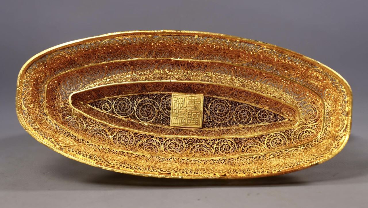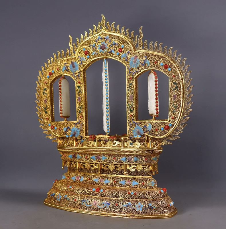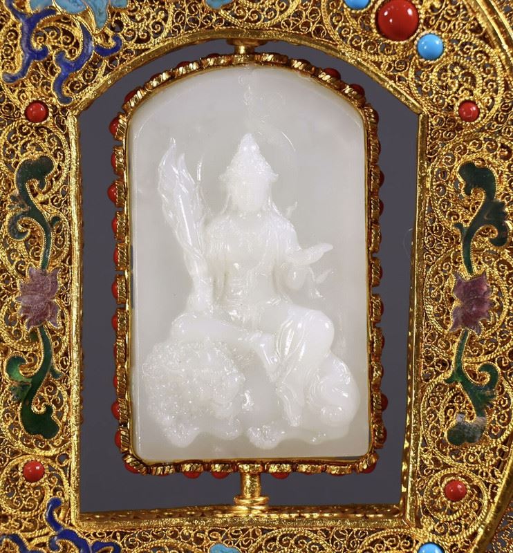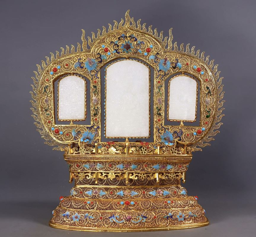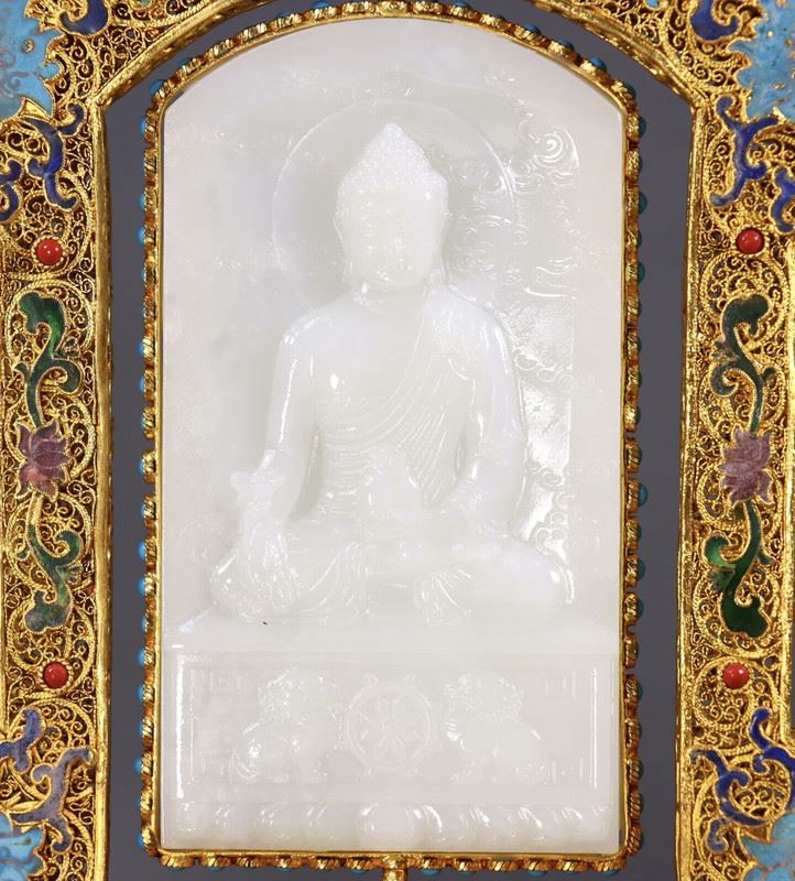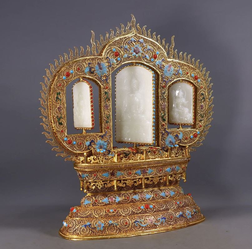 This exquisite filigree gilt inlaid Hetian jade triptych features three Buddha figures, each carved from Hetian jade, set within a frame of intricate gold filigree and embellished with gemstones. The design highlights the solemnity of the three sacred Buddhas while incorporating the radiance of gold and jewels, symbolizing both the sacredness and wealth of Buddhism.