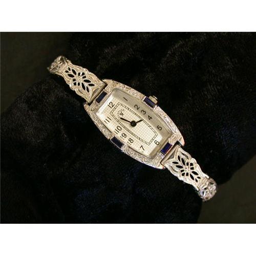 <table width="100%" border="0" cellspacing="0" cellpadding="4"><tr><td><em> </em></td></tr><tr> <td width="100%"> This Wristwatch is an Authentic & Accurate copy of a filigree watch from the 1930's - and THIS one is in Mint condition. It RUNS PERFECTLY! It is an Antique Style Sterling Silver wristwatch featuring a rectangular face surrounded by 4 Genuine Blue Sapphires. There is a Sapphire stem as well. The band of the watch features magnificent filigree work. The clasp adjusts for different wrist sizes. The case of the watch is surrounded by exquisite engraving, and the back has engraving is well. </td></tr><tr> <td> </td></tr><tr> <td>Reference #: 57893</td></tr><tr><td>Condition:Mint</td></tr><tr><td>Year:1980</td></tr><tr><td>Title:Filigree Ladies Wristwatch SAPPHIRES</td></tr><tr><td>Location:Virginia</td></tr></table>
