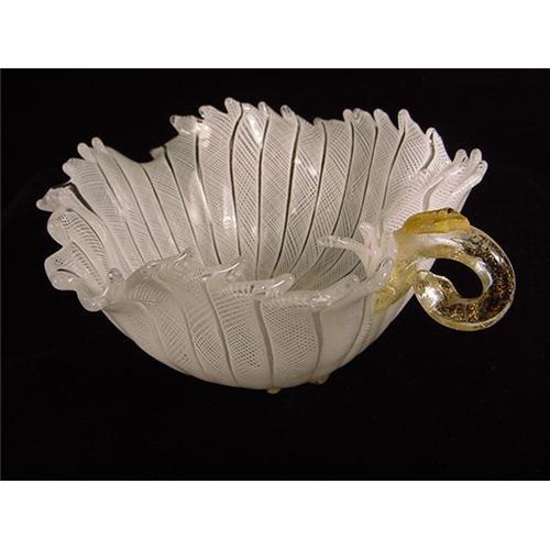 6 inch x 5 1/2 inch x 3 inch ** Nut Dish with Gold Leaf in Clear Glass Handle on a Twisted and Applied Base as on the Handle ** Ruffled Edge ** Exquisite ** Although other countries copied the Italian Filigree technique, I believe this to be late 1800s Italian Filigree. ** A small chip on the top of the handle does not detract from its beauty and is hard to find. ** Otherwise Excellent Condition