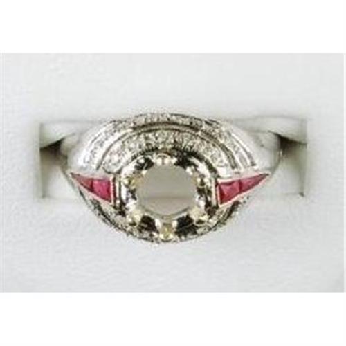 Antique 14k White Gold Mounting featuring Sparkling DIAMONDS all around and Calibre Genuine RUBYS either side. The opening is approximately 5mm across which should accomodate a 5mm Gemstone or Diamond. This ring is a Size 7 and it can be resized.