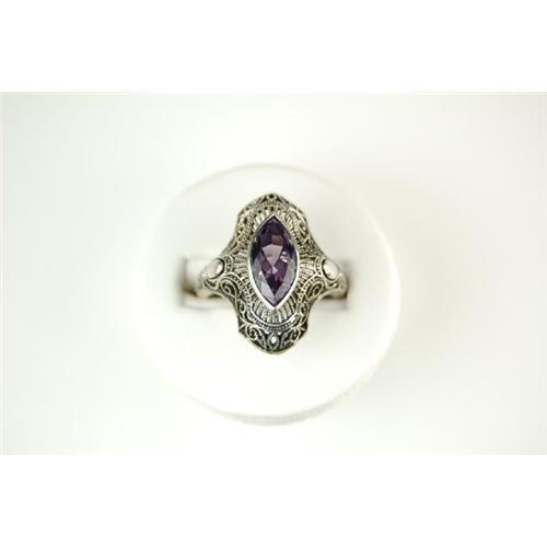 This Antique Style ring is an Authentic and Accurate copy of a ring from the 1930s and THIS one is in MINT condition! It is Solid STERLING Silver and it features a Marquise Cut Genuine Amethyst = 4 Carats! The Amethyst is surrounded by the beautiful filigree work. This ring is now a size 8 and I can easily resize it for you. It is in 'brand new' condition.