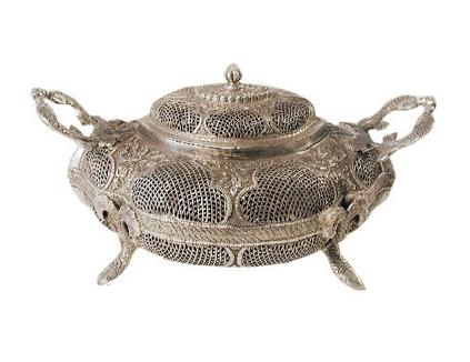 Filigree Round Pot with Handles and stand shape Jewelry Box - Hand Made Sterling Silver Round shape Jewelry Box/ Utility Box - 48 Oz (1500 Grams) Approximate "Timeless Treasure" by Shakuntalam Silvercraft.