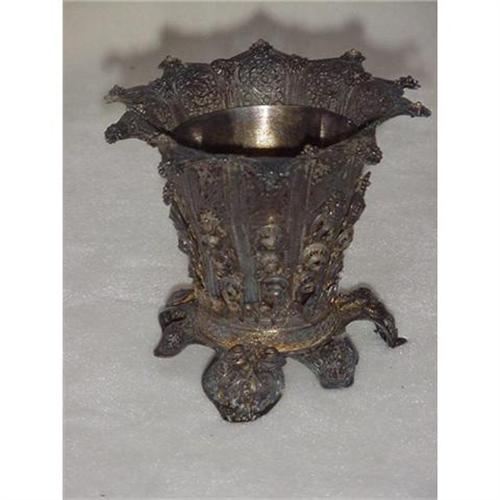Silver plated Filigree Vase 4 1/2" tall x 5" diameter. Removable silver plated container that hold flowers. Unmarked, minor damage.