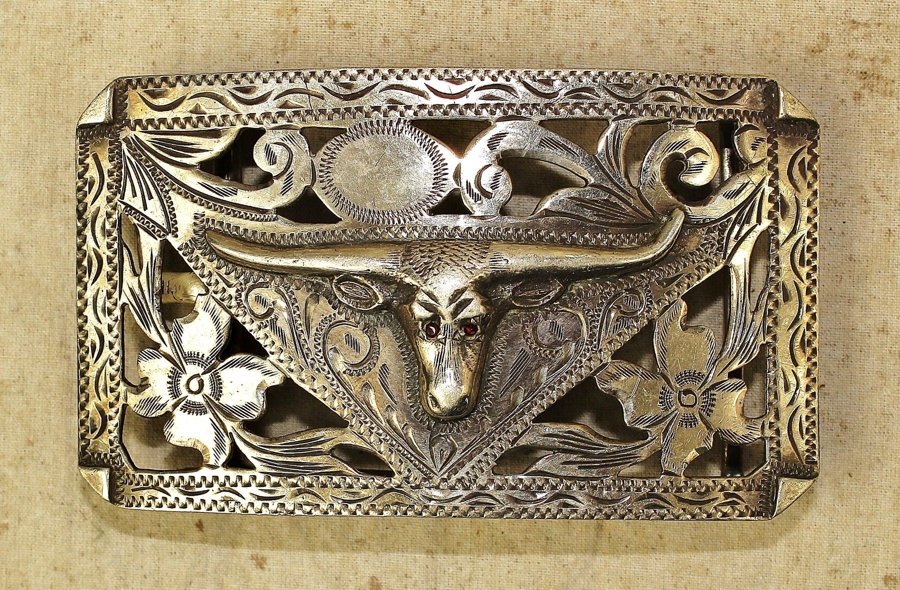 A remarkable fully engraved sterling silver belt buckle with 3-dimensional steerhead with rhinestone eyes. Measures 2 x 3 1/2".