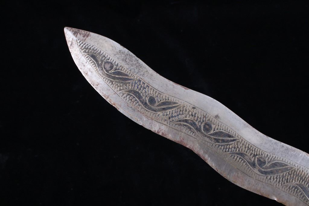 Offered in this lot is a traditional Filipino Moro, kris sword with wooden sheath. The Kris is a traditional Indonesian weapon featuring a distinctive wavy blade and integrated guard. The blade displays a tooled design across the center of the blade with a file and leaf patterns. The grip shows a wooden base with a thick cord construction. The piece comes with a wooden sheath decorated with woven cord designs. The piece shows good condition overall, with some wear across the piece and some damage on the top of the sheath. The sword measures 24 3/4" long overall, with the blade measuring 20 1/4" long.