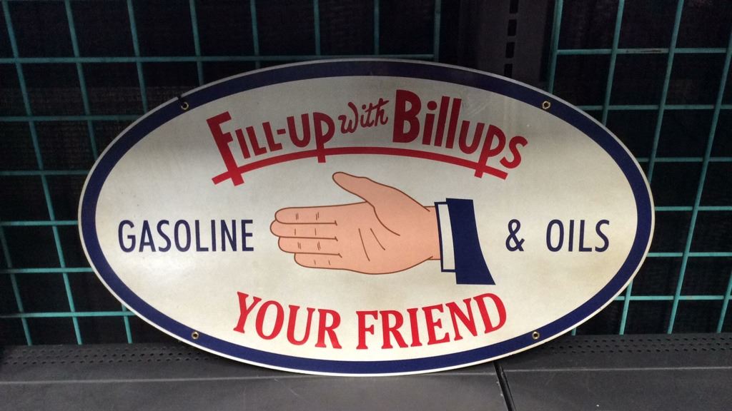 Fill-up With Billups Porcelain Sign Fill-up with Billups gasoline & oils Your friend 28 in wide, 16 in tall