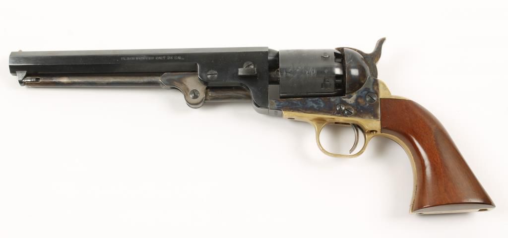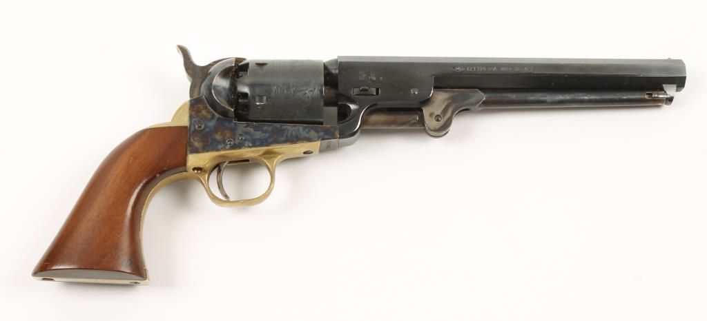 Italian made copy of the Colt cap and ball Navy revolver. Brass grip frame. Color case hardened frame, hammer, trigger and loading lever. Blued cylinder and barrel. Cylinder is engraved with a naval battle. Cylinder shows some marks from bolt missing the recesses. Overall metal condition is very good with a few tiny light scratches. Wood grips are in good condition with a few dings and dents. Action is very good. Condition: Good to Very Good. *Antique Firearm*