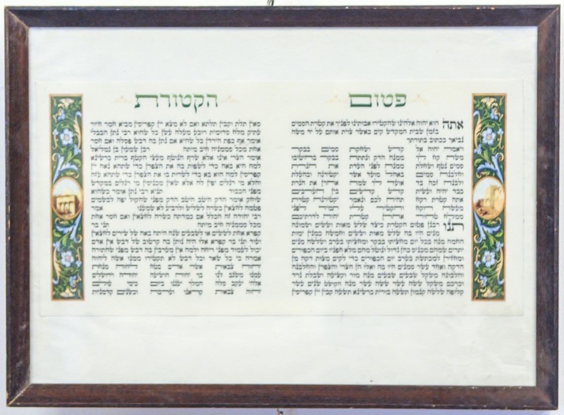 Filling the Pipe - lithography print on scroll paper, decorated on either side with color print of flowers, Jerusalem's city walls on the one side and Yad Avshalom on the other. Framed, dimensions: 32x16 cm.