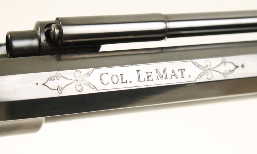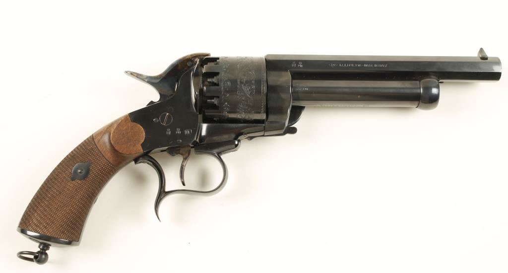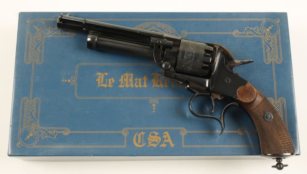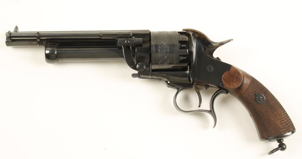 Blued and case-hardened single-action 9-shot cylinder and one shotgun barrel revolver with a 6-3/4" barrel and factory box. Finish is immaculate. Action is tight. Bore is pristine. Condition is near fine. *Antique Firearm*