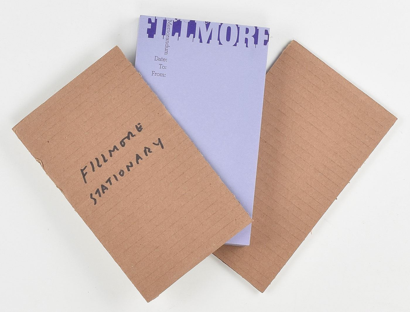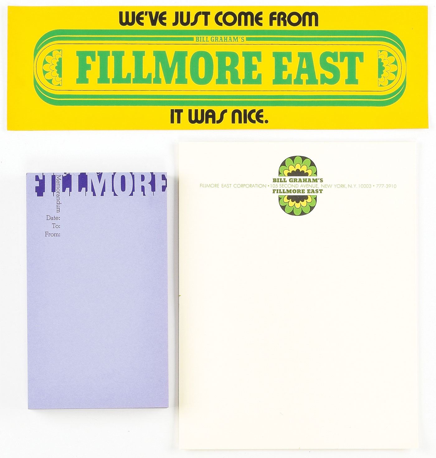 Collection of original vintage circa 1960s Fillmore East ephemera, including: an unused 15 x 4.5 bumper sticker, reading, "We've Just Come From Bill Graham's Fillmore East, It Was Nice," retaining its original backing; eleven blank sheets of 8.5 x 11 Fillmore East stationery; and a thick purple 5 x 8.25 "Fillmore Memorandum" notepad. In overall fine to very fine condition.