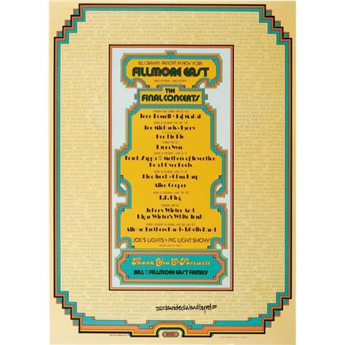 <B>Fillmore East "Final Concerts" Poster, FME-011, Signed by the Artist (Bill Graham, 1971)</B></I> The final month of shows at New York's fabled Fillmore East were advertised on this very attractive poster, designed by David Byrd. The Art Deco-influenced design includes the names of many of the performers who played the hall as a background. The list of upcoming events includes such names as Leon Russell, Humble Pie, Laura Nyro, Frank Zappa, Alice Cooper, B. B. King, Johnny and Edgar Winter, and the Allman Brothers Band, among others. The poster was only printed once, and measures approximately 18" x 24.5", and is in NM- condition. David Byrd signed the poster in black marker.<BR><BR><b>Shipping:</b> Flat Material, Large (<a target="_blank" href="http://www.heritageauctions.com/common/shipping.php">view shipping information</a>)
