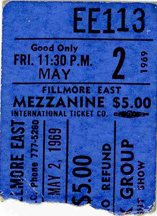 1969 ticket stub from Jeff Beck and Joe Cocker concert at the Fillmore East in New York. Dated 2 May 1969. Bill Graham's east coast counterpart to his Fillmore West, the Fillmore East was a short-lived venue, operating from 1968 to 1971. In that time it hosted an unmatched array of legendary rock acts. Ticket is torn, as original, otherwise fine condition.