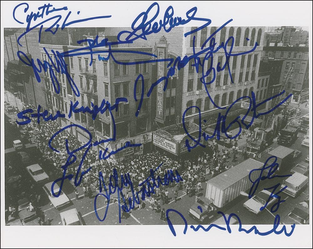 Glossy 10 x 8 photo of the exterior of the Fillmore East, signed in blue felt tip by twelve former house acts: Pete Townshend, John Kay, Dickie Peterson, John Sebastian, Marty Balin, Dino Danelli, Gene Cornish, David LaFlame, Jerry Velez, Steve Knight, Cynthia Robinson, and Jerry Martini. In fine condition.