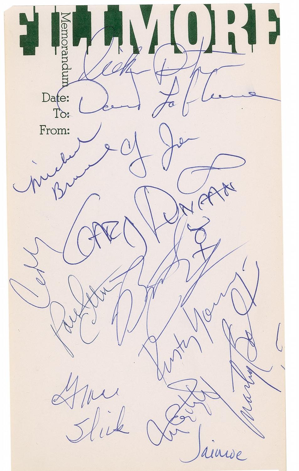 Unique 7 x 4 sheet of Fillmore office memo paper signed in blue ballpoint by 13 former performers: Marty Balin, Grace Slick, Country Joe, Michael Bruce, Gary Duncan, Corky Laing, Butch Trucks, Jaimoe, Rusty Young, Paul Cotton, Dickie Peterson, David LaFlame, and Tom Constanten. In fine condition, with edge toning and a missing upper left corner tip.