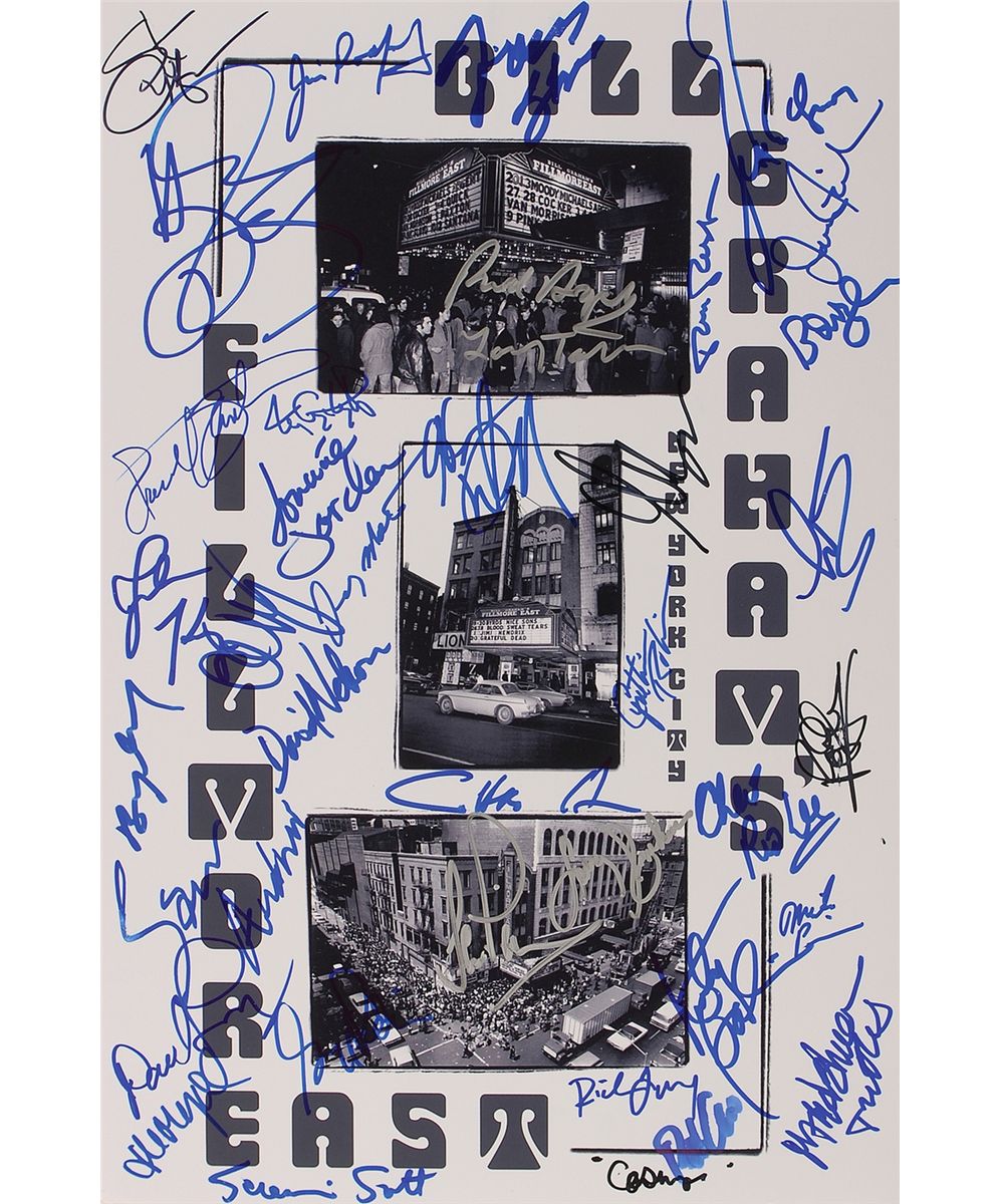 Satin-finish 12 x 18 composite photo of the marquee of the Fillmore East, signed in felt tip and ink by 38 performers. Signers are: Paul Kantner and Marty Balin (Jefferson Airplane), John Kay (Steppenwolf), Chris Hillman (The Byrds), John Mayall, Chuck Negron (Three Dog Night), Richie Furay (Buffalo Springfield), Mark Volman and Howard Kaylan (The Turtles), Gregg Rolie (Santana), Harvey Mandel and Larry ‘The Mole’ Taylor (Canned Heat), Tom Constanten (Grateful Dead), Scott Simon and Bowzer (Sha Na Na), David Nelson (New Riders of Purple Sage), David Frieberg (Quicksilver Messenger Service), Doug Cosmo Clifford (Creedence Clearwater Revival), Ric Lee and Leo Lyons (Ten Years After), Martin Gore (Jethro Tull), Sam Andrews (Big Brother), Ian Paice and Roger Glover (Deep Purple), Barry Goldberg (Electric Flag), Rob Grille (Grass Roots), Steve Cropper (Booker T and the MGs), Mike Pinera (Blues Image and Iron Butterfly), Larry Graham, Jerry Martini and Cynthia Robinson (Sly & the Family Stone), Lonnie Jordan (War), Tommy Shannon (Edgar Winter Band), Jim Fielder (Blood Sweat & Tears), Rod Argent (Argent), Jim Rodford (The Kinks), Tom Rush, and Jesse Colin Young. In fine condition.