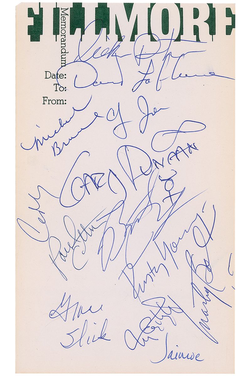 Twelve ballpoint signatures of former performers on an off-white 5 x 8.25 sheet of Fillmore East memo paper. Signers are: Grace Slick, Jaimoe, Butch Trucks, Michael Bruce, Corky Laing, Dickie Peterson, Country Joe, Gary Duncan, Rusty Young, Paul Cotton, David LaFlamme, and Tom Constanten. In fine condition, with a bit of paper loss to the upper left corner and mild toning to the edges.