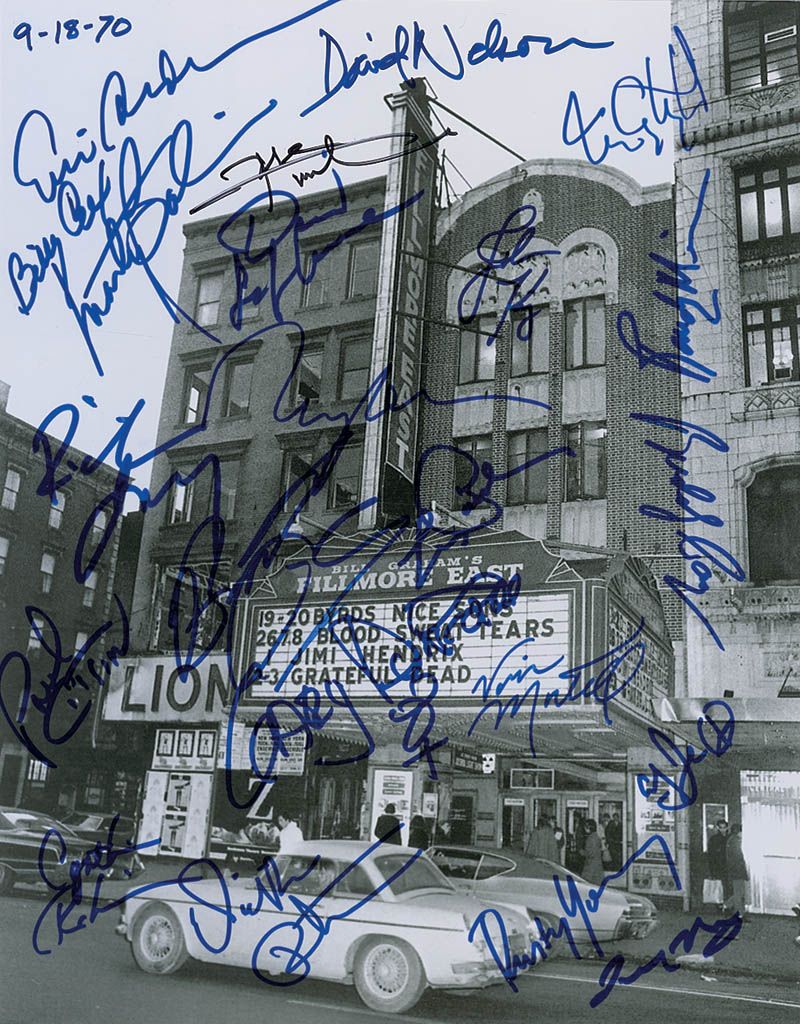 Glossy 11 x 14 photo of the legendary venue, signed in blue and black felt tip by 21 former house acts. Signers include: Pete Townshend, Les Paul, Ray Davies, Randy Meisner, Billy Cox, Butch Trucks, Eric Anderson, John Kay, Richie Furay, Dickie Peterson, Vinny Martell, Rusty Young, Paul Cotton, Gary Duncan, David LaFlamme, Buddy Cage, David Nelson, Tom Constanten, Jerry Martini, and Cynthia Robinson. In fine condition.