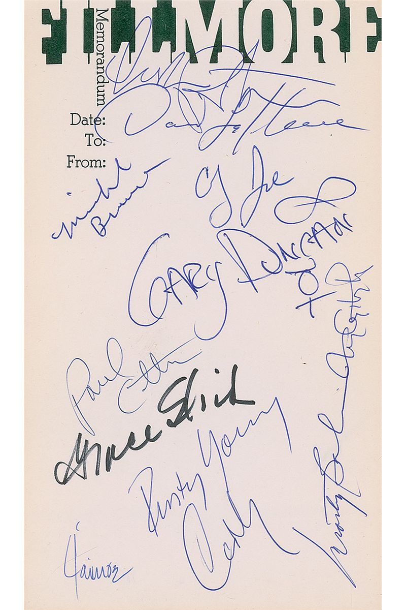 Twelve felt tip and ballpoint signatures of former performers on an off-white 5 x 8.25 sheet of Fillmore East memo paper. Signers are: Grace Slick, Marty Balin, Jaimoe, Country Joe McDonald, Michael Bruce, Gary Duncan, Dickie Peterson, David LaFlamme, Corky Laing, Rusty Young, Paul Cotton, and Tom Constanten. In fine condition.