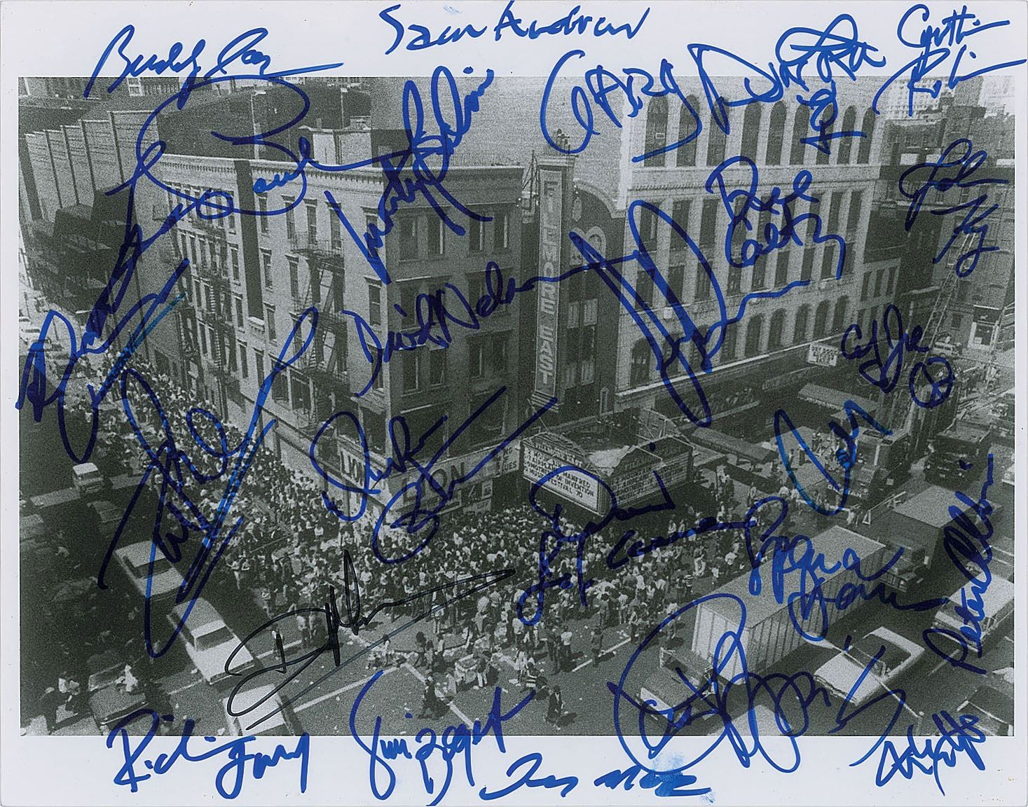 Glossy 14 x 11 photo of a massive ticket line outside of New York's Fillmore East, signed in blue or black felt tip by twenty-four of the theater's most famous musical acts, including: Les Paul, Dickie Peterson, John Kay, Marty Balin, Country Joe McDonald, Gary Duncan, David LaFlamme, Buddy Cage, David Nelson, Tom Constanten, Carl Palmer, Butch Trucks, Dave Mason, Spencer Davis, Tim Bogert, Sam Andrew, Peter Albin, Dave Getz, Jorma Kaukonen, Richie Furay, Corky Laing, Carmine Appice, Cynthia Robinson, and Jerry Martini. In fine condition.