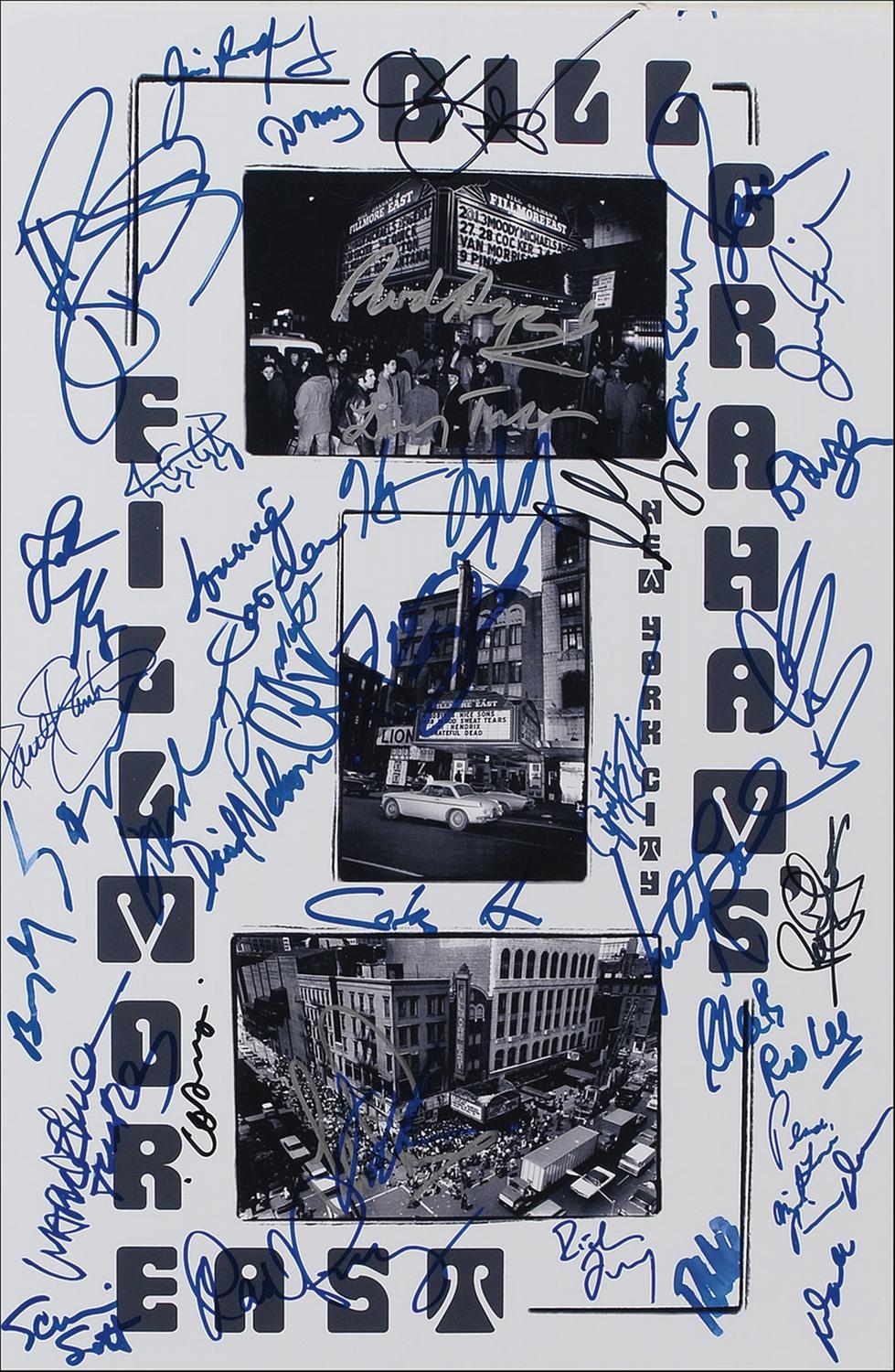 Unique satin-fish 12 x 18 photo showing three different scenes outside the Fillmore East, signed in blue, black, or silver ink by 38 musicians, all of whom were one-time acts at the famed venue. Signers are: Paul Kantner and Marty Balin (Jefferson Airplane), John Kay (Steppenwolf), Chris Hillman (The Byrds), Chuck Negron (Three Dog Night), Richie Furay (Buffalo Springfield), Mark Volman and Howard Kaylan (The Turtles), Harvey Mandel and Larry ‘The Mole’ Taylor (Canned Heat), Tom Constanten (Grateful Dead), Donny York, Screamin’ Scott Simon and Bowzer (Sha Na Na), David Nelson (New Riders of Purple Sage), David Frieberg (Quicksilver Messenger Service), Doug Cosmo Clifford (Creedence Clearwater Revival), Ric Lee and Leo Lyons (Ten Years After), Martin Gore (Jethro Tull), Sam Andrews ( Big Brother), Ian Paice and Roger Glover (Deep Purple), Barry Goldberg (Electric Flag), Rob Grille (Grass Roots), Steve Cropper and Donald ‘Duck’ Dunn (Booker T & the MGs), Mike Pinera (Blues Image and Iron Butterfly), David Sanborn (Butterfield Blues Band), Jerry Martini and Cynthia Robinson (Sly & the Family Stone), Lonnie Jordan (War), Tommy Shannon (Edgar Winter Band), Jim Fielder (Blood Sweat & Tears), Rod Argent (Argent), Jim Rodford (The Kinks), Tom Rush, and Jesse Colin Young. In fine condition with some signatures overlapping.