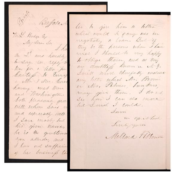 Fillmore, Millard. Autograph letter signed, 2pp (recto/verso) with integral blank leaf, 7¾ x 5", Buffalo, N.Y., Oct. 8, 1856. Marked "Private." The ex-President writes "in great haste" to W.L. Hodge, regarding a requested endorsement for a Mr. and Mrs. Curtis: " ….I hardly know what to say in reply to your application for a letter for Mr. & Mrs. Curtis to Europe. I know a Mr. & Mrs. Curtis slightly for having met them at N. York and Washington. They were both pleasant genteel people…especially Mr. C…but I do not know his given name, nor whether he is the gentleman to whom you allude, and even if I did, I have not sufficient knowledge of his business, talents, or character to give him a letter which would be of any use in negotiating a loan.But if they be the persons whom I have met I should be very happy to oblige them and…I will most cheerfully endorse any letter which Mr. Brown or Mr. Palmer, bankers, may give them. I do not see how I can do more but I wish I could." A great example of presidential double-speak.