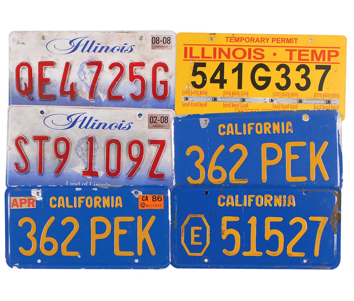 Collection of nine screen-used license plates and temporary tags. Items are: three license plates and three temporary tags used in the 2010 film Cash, starring Sean Bean and Chris Hemsworth, including from Bean’s car and Hemsworth’s Jeep; a blue and yellow California plate used in the 1984 film The Terminator; and two blue and yellow California plates from Goldie Hawn’s car in the 1980 film Seems Like Old Times. Accompanied by a 2014 letter of authenticity which states “all obtained from the prop masters on the relevant production.” In fine condition, with expected wear and paint chipping.