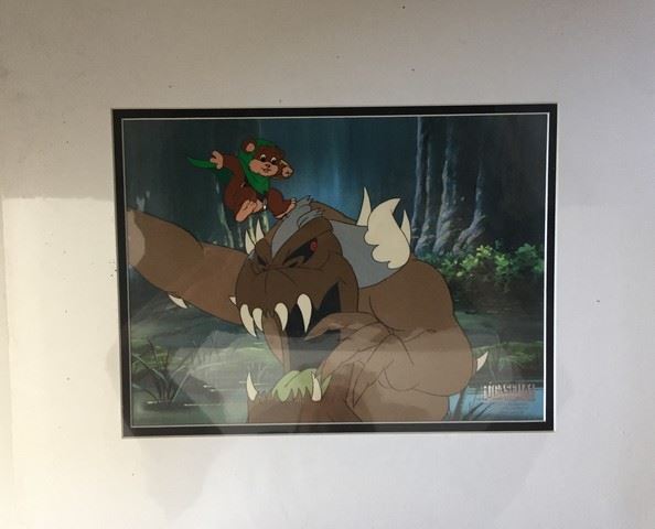 Star Wars "Ewoks" Animation Cel (featuring "Wicket" battling a large forest creature / 1985 / Lucasfilm Ltd. / 12" x 9") (some ink from cel has bleed and stuck to plastic)