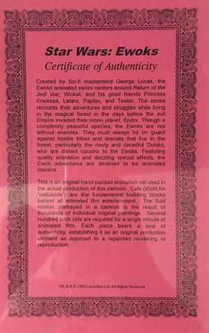 Star Wars "Ewoks" Animation Cel (featuring "Wicket" running from danger / 1985 / Lucasfilm Ltd. / 12" x 9") (some ink from cel has bleed and stuck to plastic)
