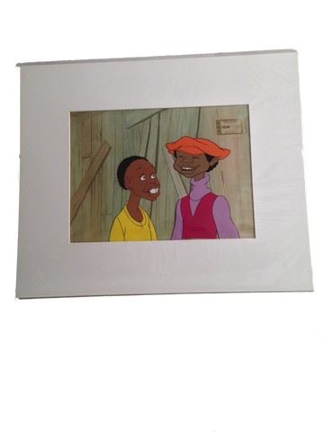 "Fat Albert" Animation Cel (featuring "" Rudy and Bucky") standing in front of a fence, original hand painted production cel.(18x15)