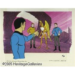 <B>Filmation Studios - "Star Trek" Hand Painted Limited Edition Cel (40/400) (1973).</B></I> Standing before the Guardian of Forever, Aleek-Om, an Aurelian, is questioned by Spock about a point in Vulcan history, as Captain Kirk and Doctor McCoy look on. This beautiful limited edition cel is based on the episode universally heralded as the very best of the animated stories, "Yesteryear", sequel to Harlan Ellison's original series episode "City on the Edge of Forever". Measuring an overall 8" x 12", this art is framed within a 14" x 18" white matte board. The art is numbered and authenticated and in Excellent condition. <I>From the collection of Richard and Wendy Pini. Richard says: "For fans of "Star Trek" who couldn't get enough from syndication after the original television series was cancelled, the animated Filmation cartoons were a godsend -- especially as many of the were written by the same top-notch talents who had contributed to the live-action show. This particular image (there were several offered at the time) has an amusing error -- can you spot it? Hint: count the number of fingers on Spock's pointing hand...."</B></I>