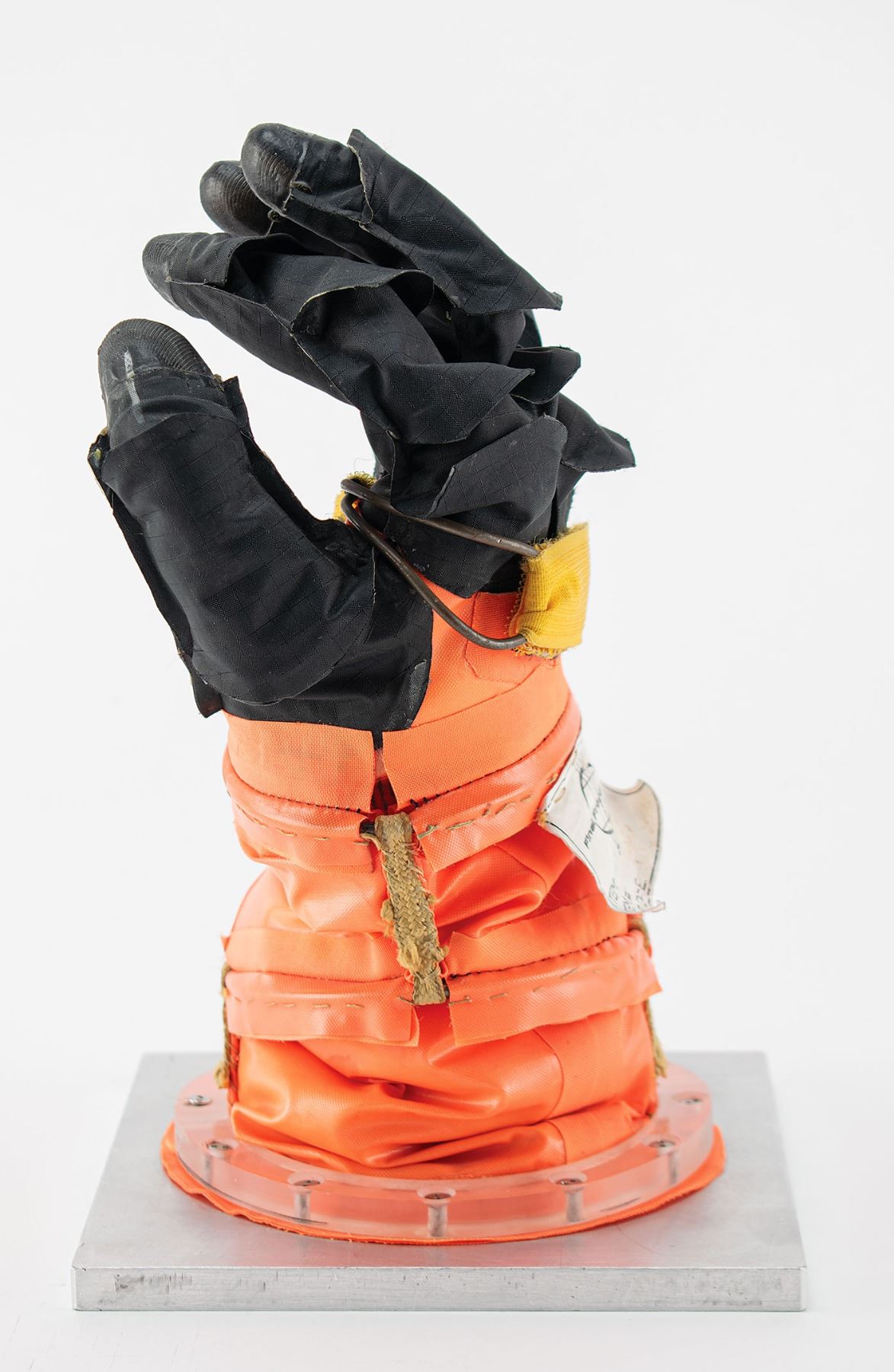 Desirable EVA space suit glove prototype made by Final Frontier Design (FFD) in 2012 for testing with FFD space suits. The glove features an orange wrist joint and palm with black fingers and fingertips, and a Final Frontier Design tag sewn on the glove back side. Mounted on a thick metal plate for display. In fine condition, with expected wear.