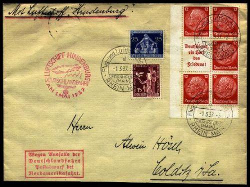 Final Trip of the Hindenburg. Two items: 1) Attractive large envelope with four handstamps, three tied "Lüftschiff Hindenburg, 1 Mai 1937," block of six stamps and two single stamps. This first North American flight of the Hindenburg ended in disaster at Lakehurst, N.J. on May 3. Its voyage within Germany was cancelled. Marked "Mail to be dropped on North American flight"; mail was dropped at Cologne on its journey to Lakehurst. 2) Real-photo postcard showing Hindenburg and Graf Zeppelin in flight. Mailed 1938, message in German. Nice pair. Very fine.