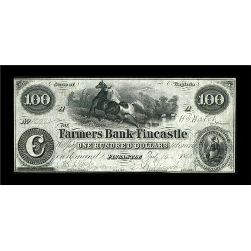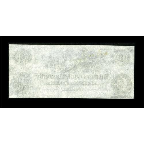 <B>Fincastle, VA- The Farmers Bank of Fincastle </B></I>$100 July 16, 1862 Jones BF25-50 G10<BR> All of these notes are remainders, with the Jones reference noting "This note was never issued by the bank." <B>Uncirculated, </B></I>falsely filled in, but very scarce, rated as a Rarity 6G in the Virginia reference. <BR><BR><b>Shipping:</b> Coins & Currency (<a target="_blank" href="http://www.heritageauctions.com/common/shipping.php">view shipping information</a>)